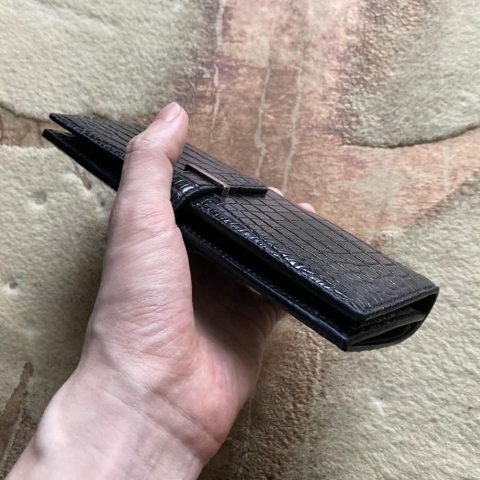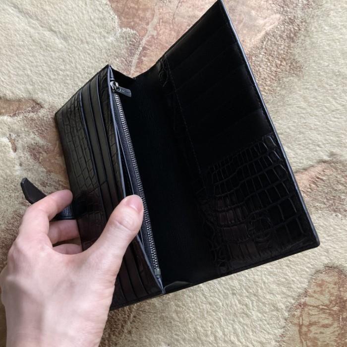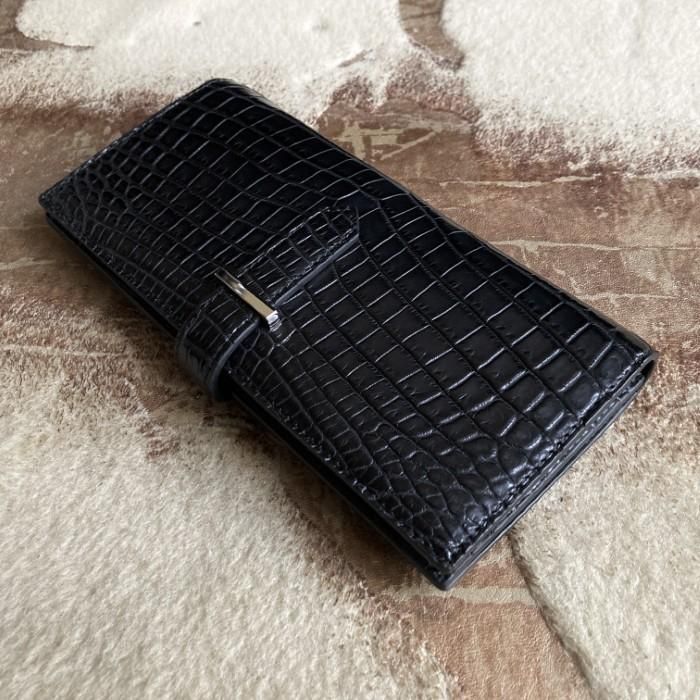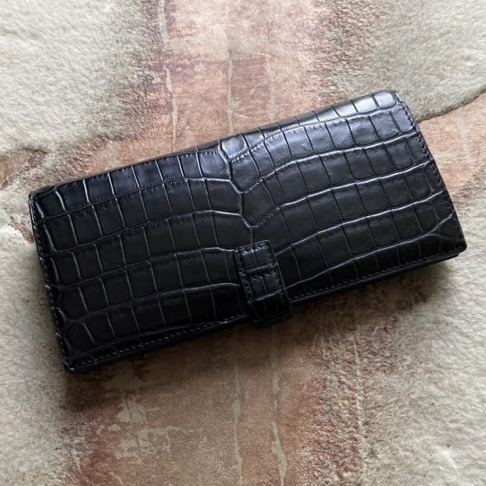 程よい光沢感があるナイルクロコダイルのブラックを使用した二つ折り長財布が完成しました。