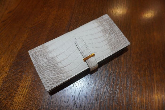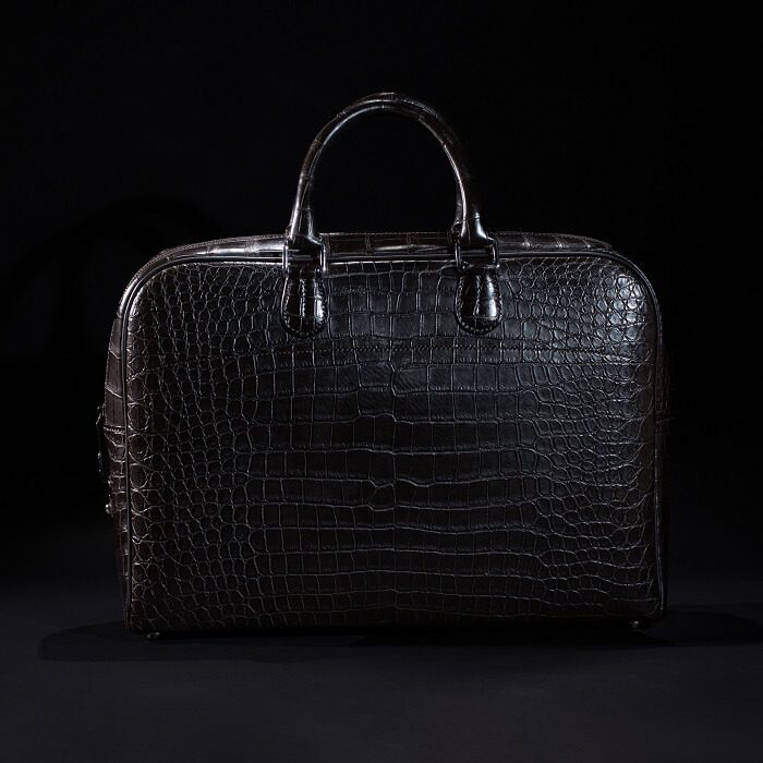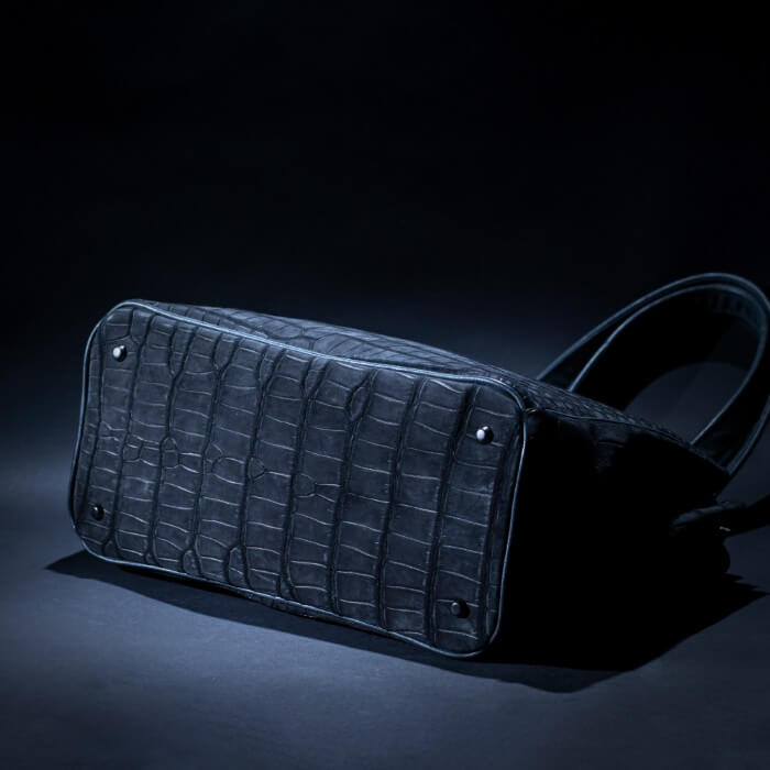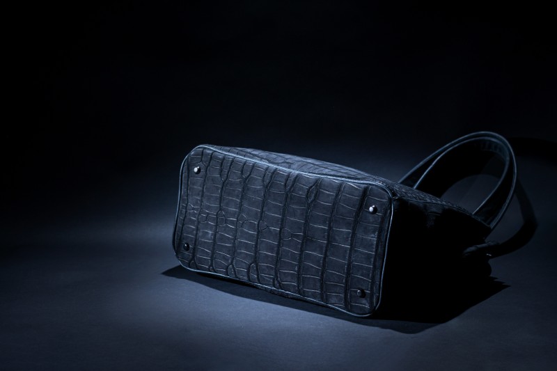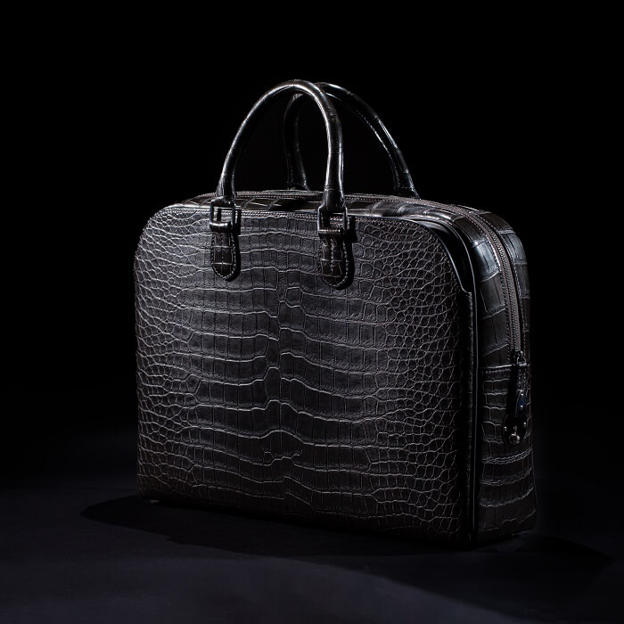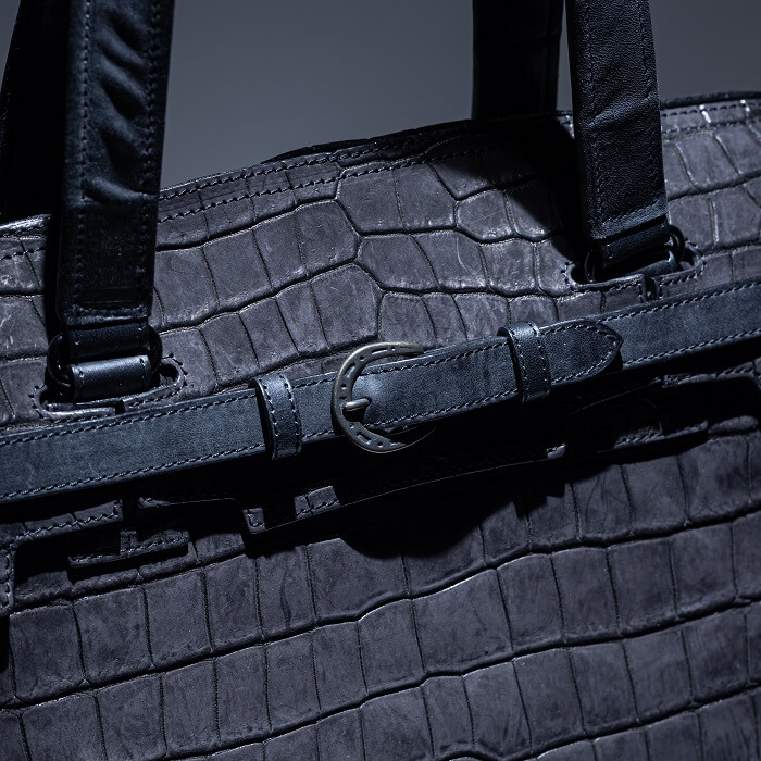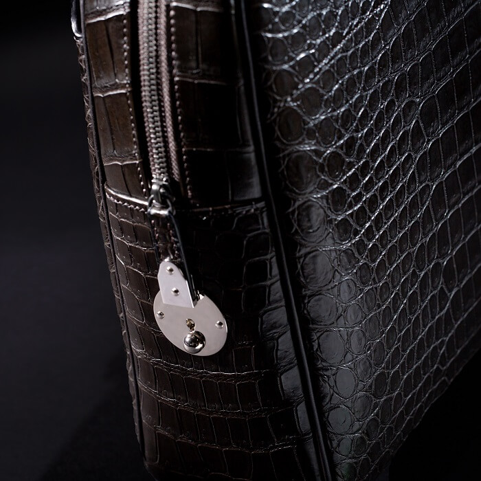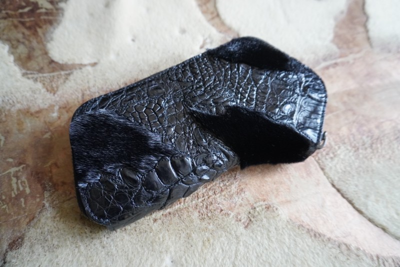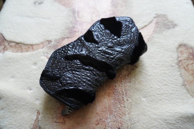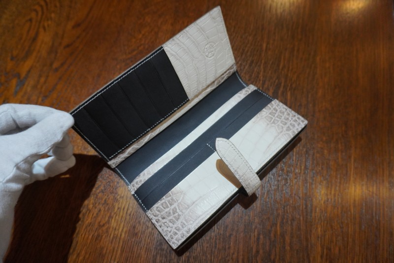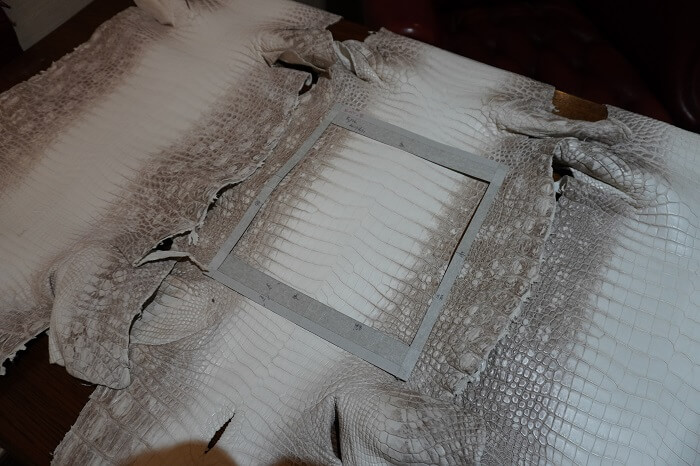 クロコダイルの色々な部位を縫い合わせて一枚革の様に見せる、独特の技法を用いています。