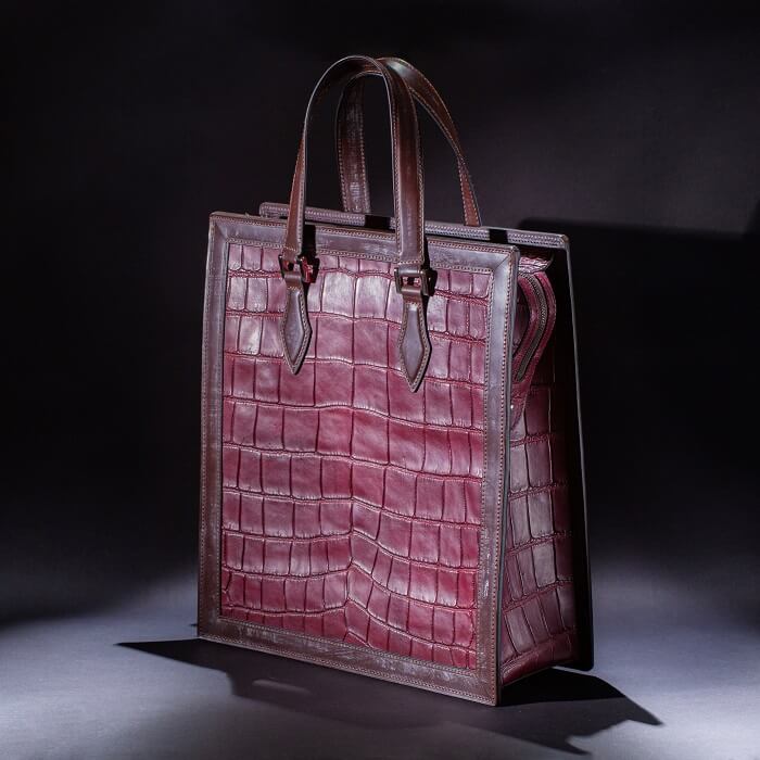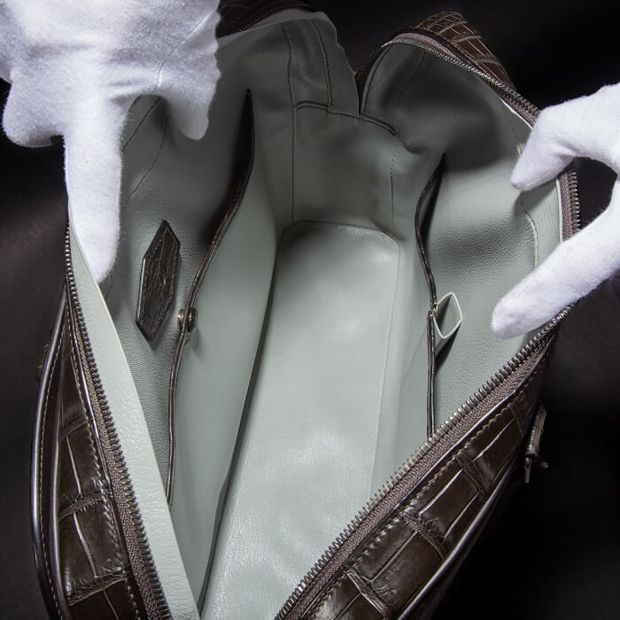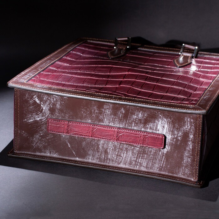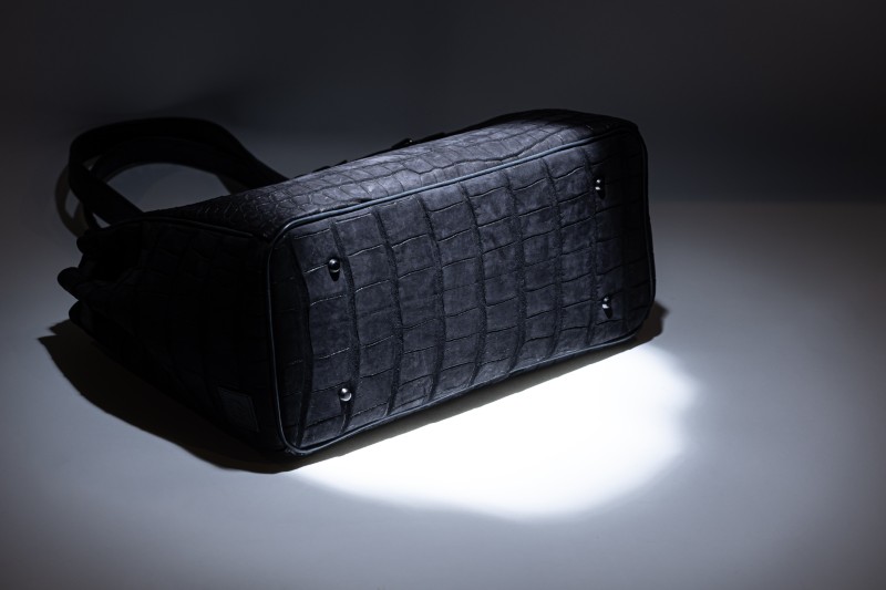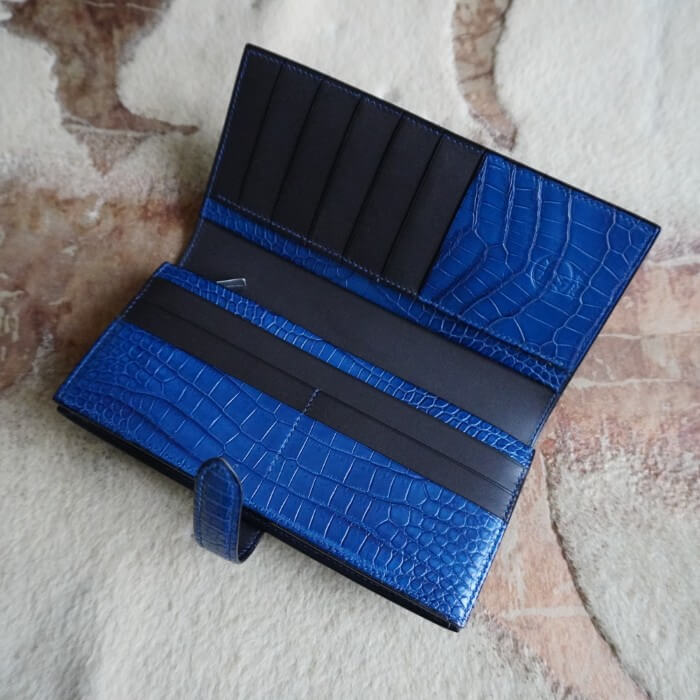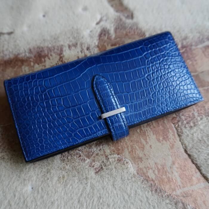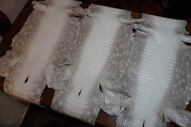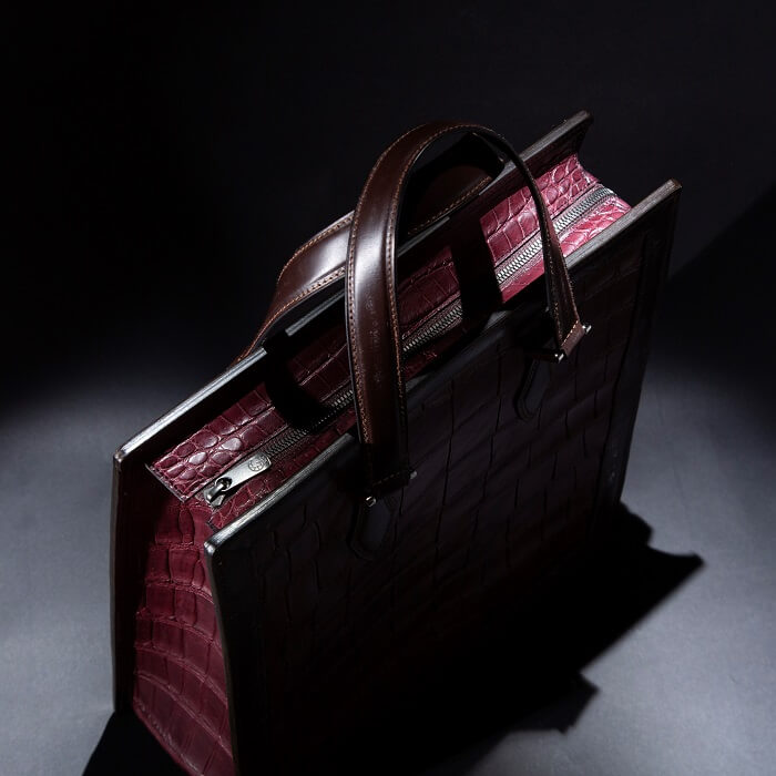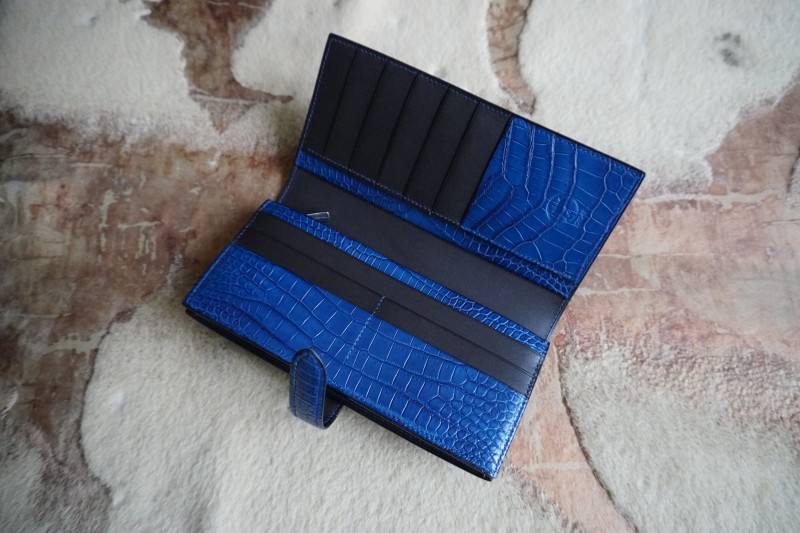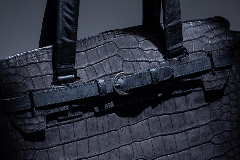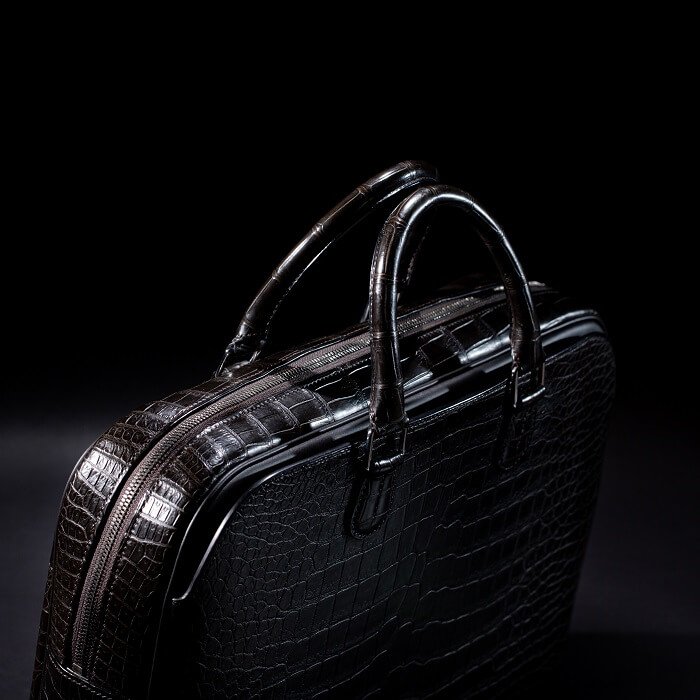 クロコダイルの色々な部位を縫い合わせて一枚革の様に見せる、独特の技法を用いています。