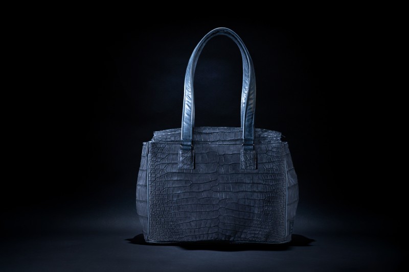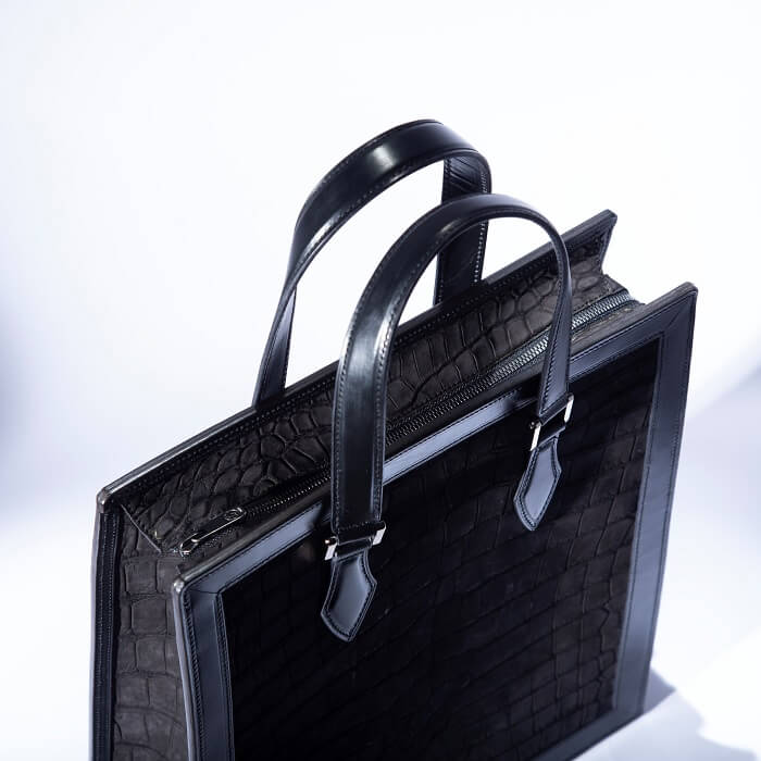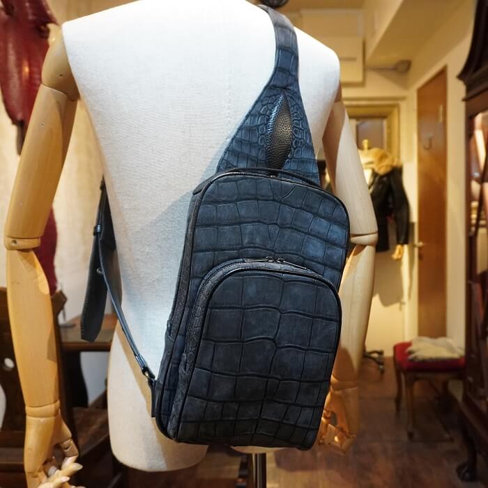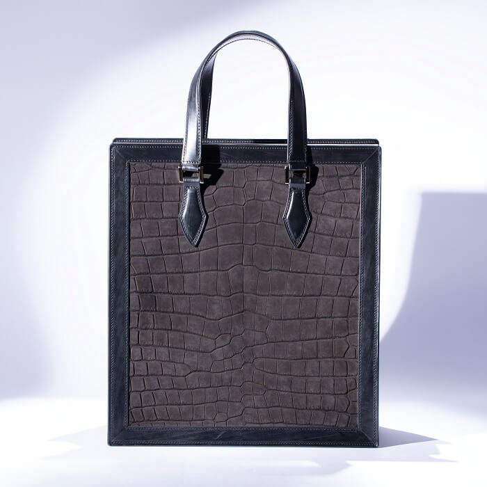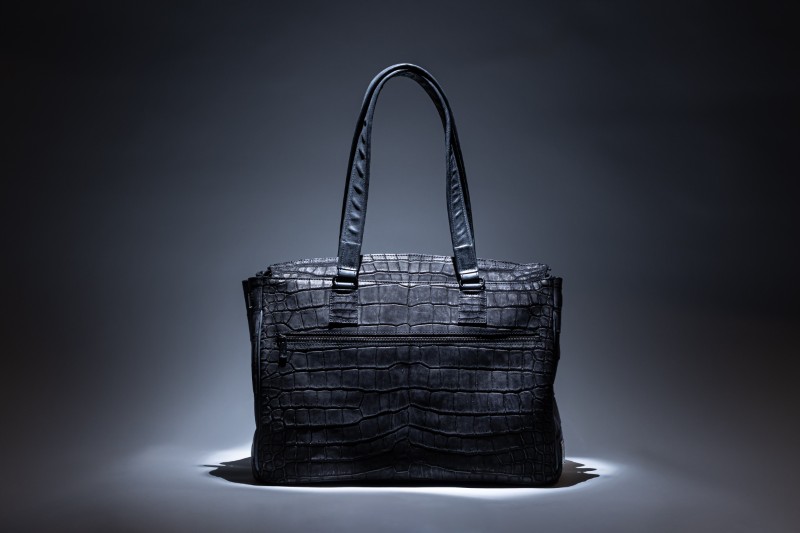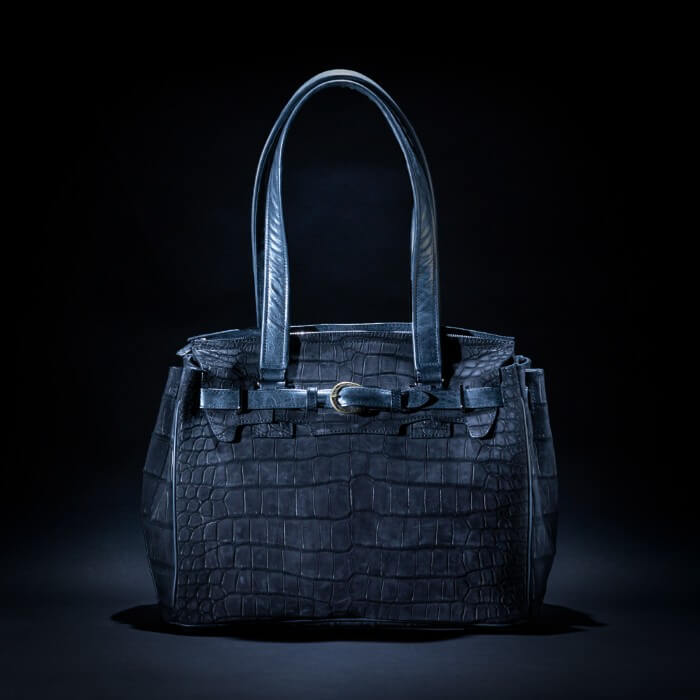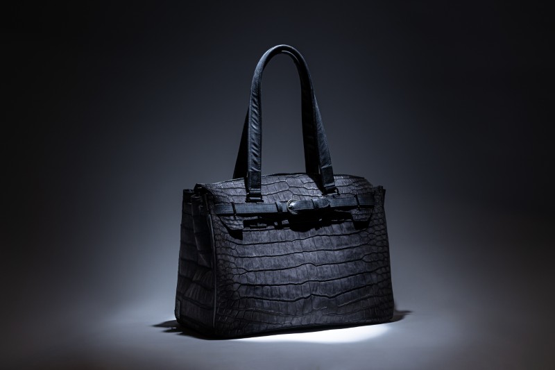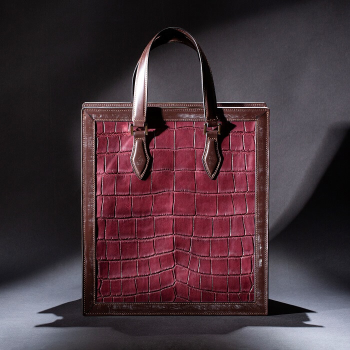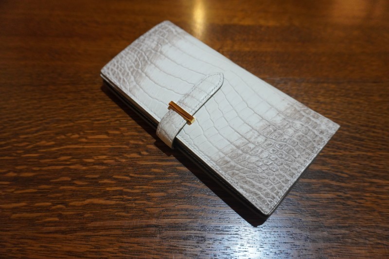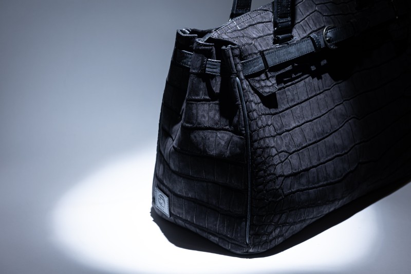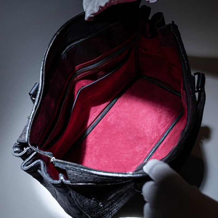 クロコダイルの色々な部位を縫い合わせて一枚革の様に見せる、独特の技法を用いています。