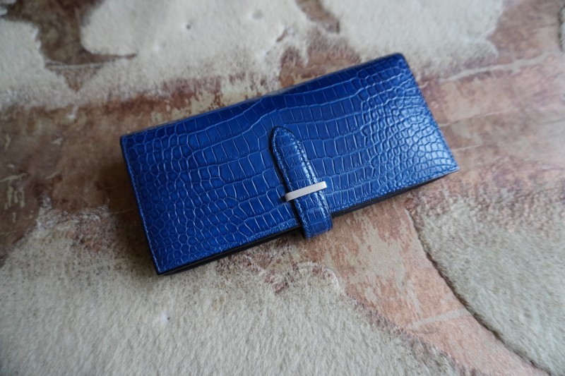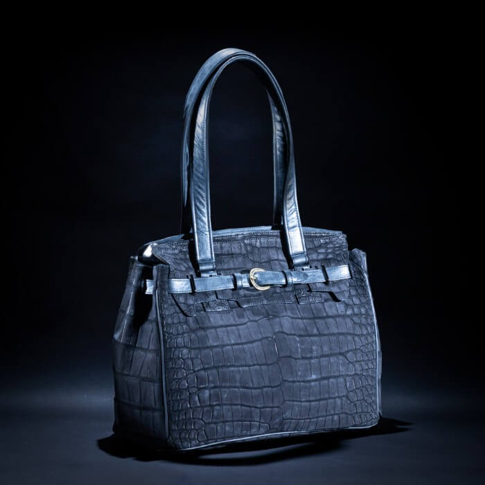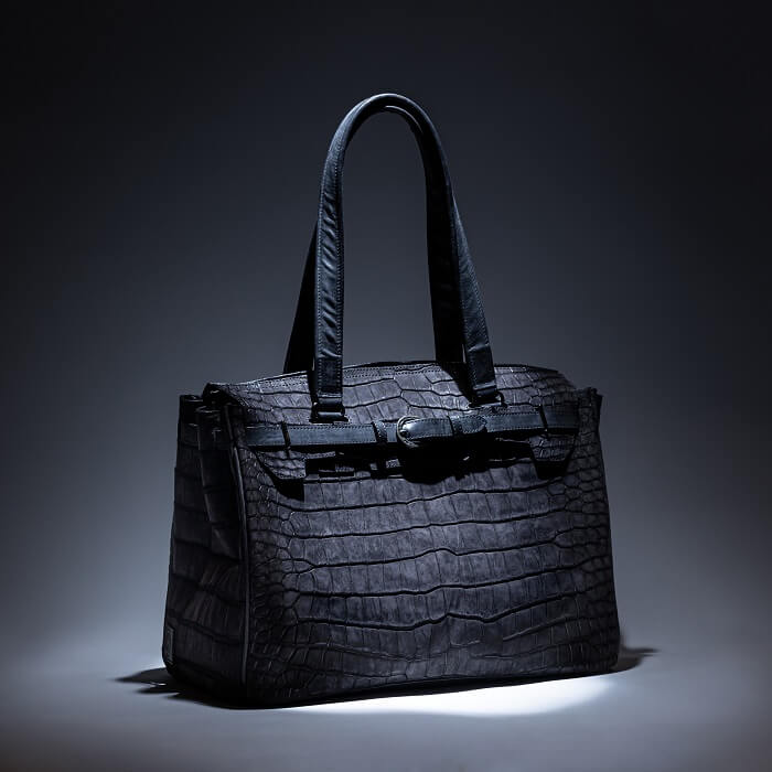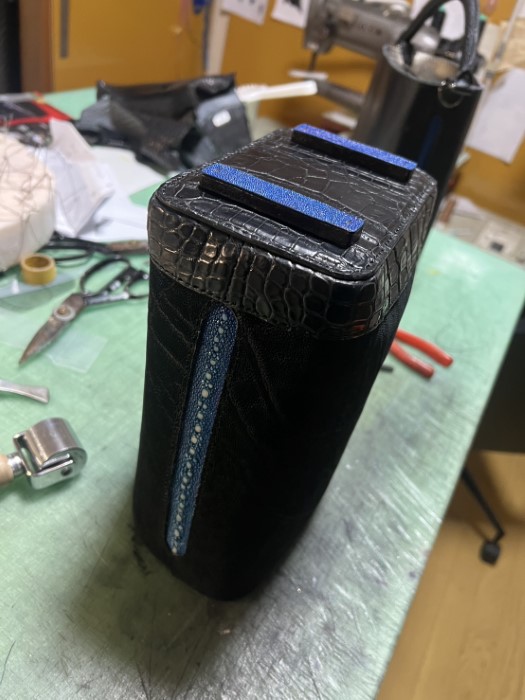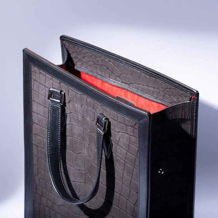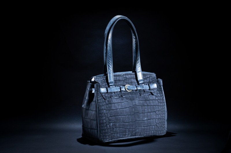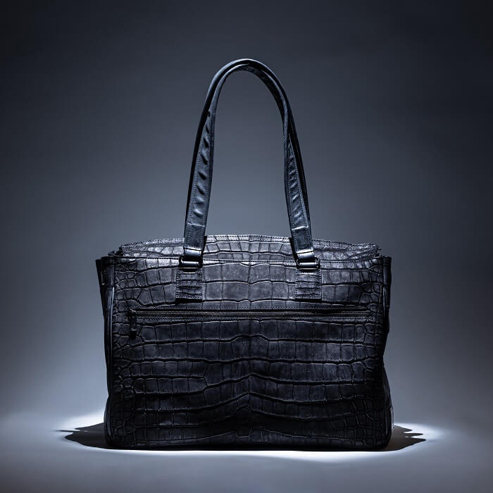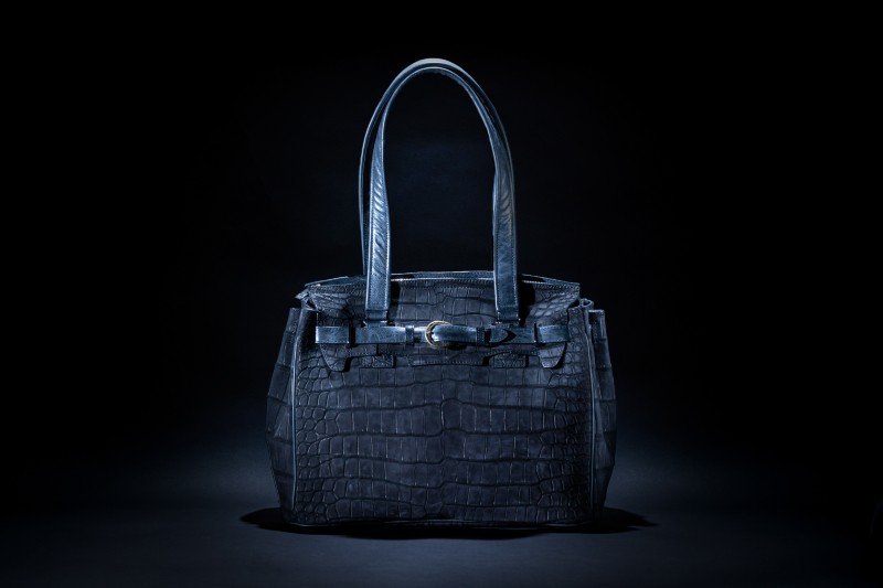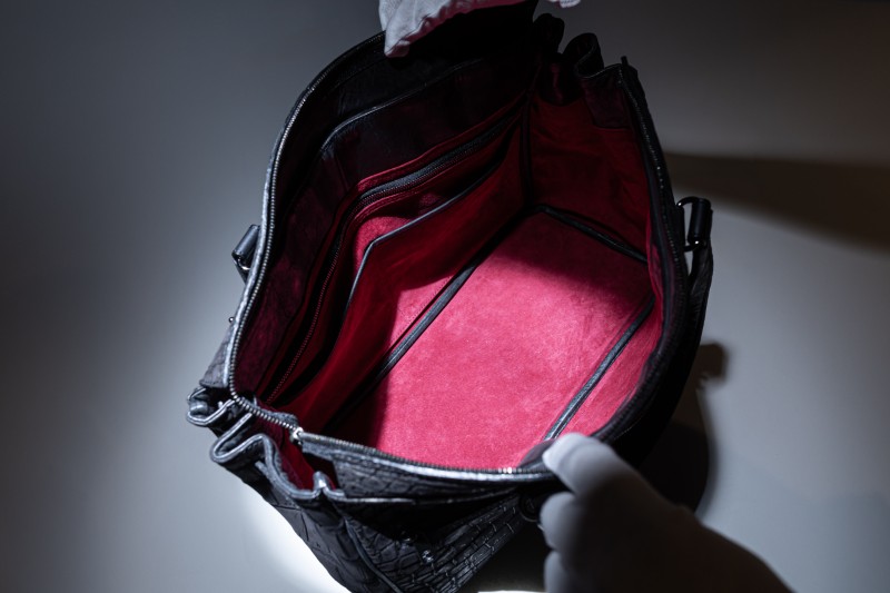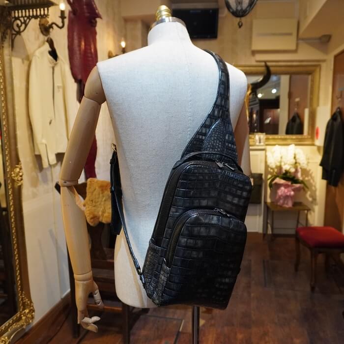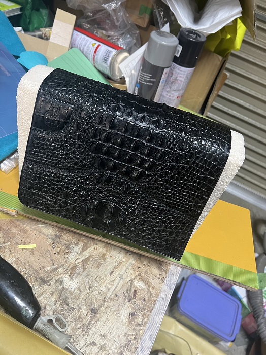 クロコダイルの色々な部位を縫い合わせて一枚革の様に見せる、独特の技法を用いています。