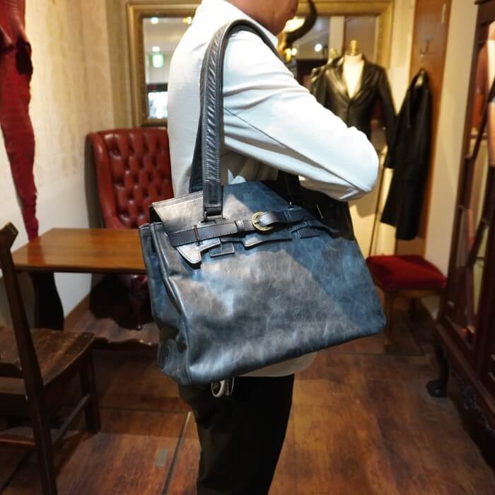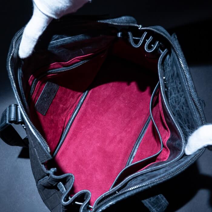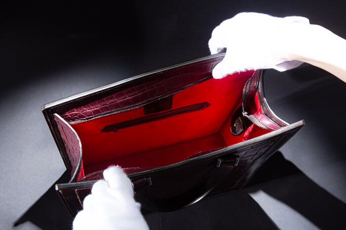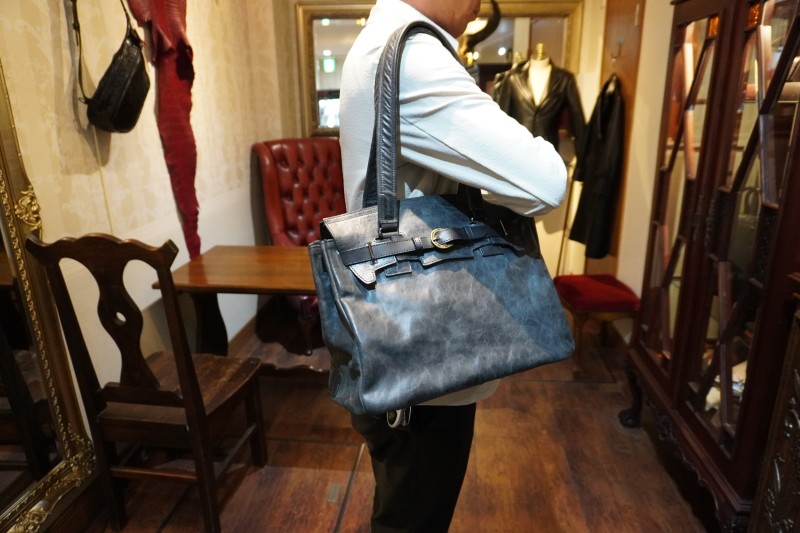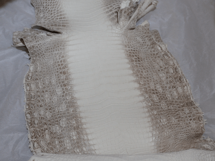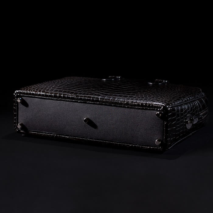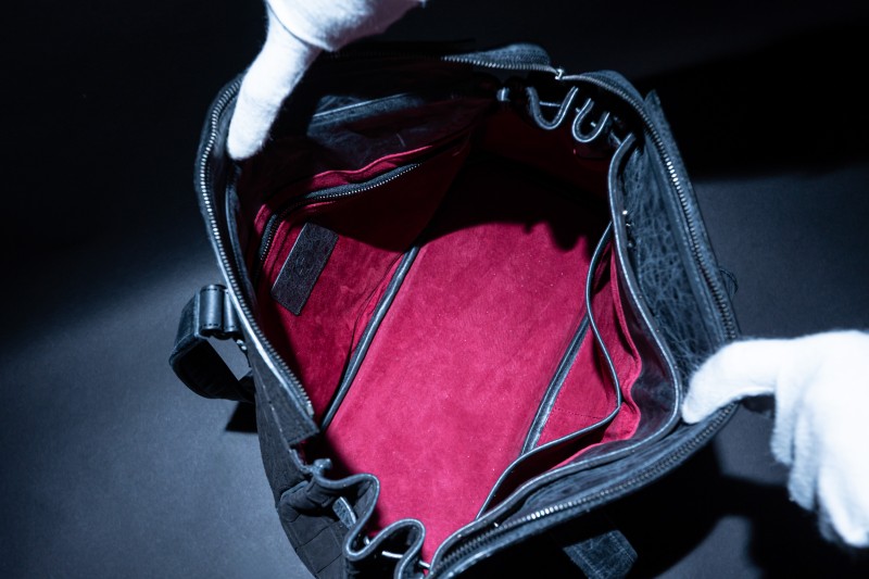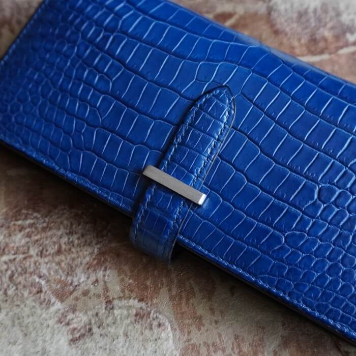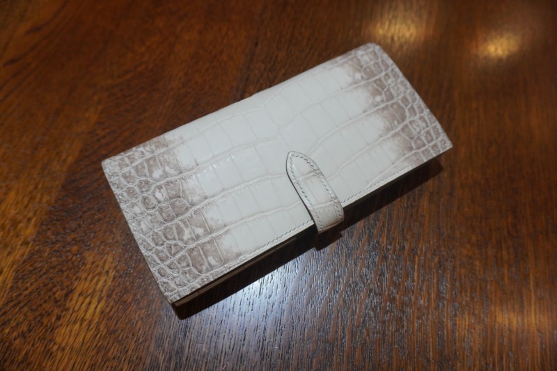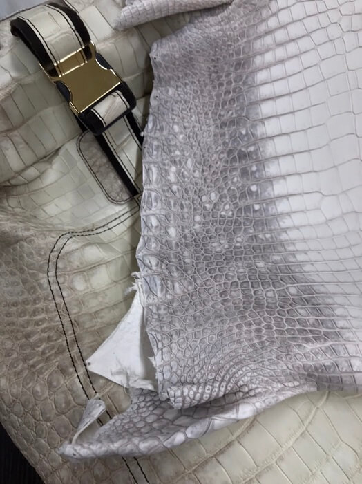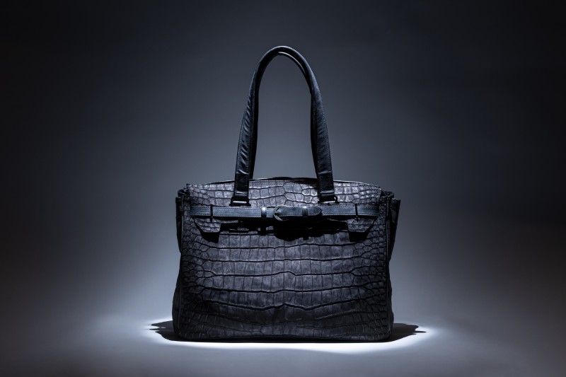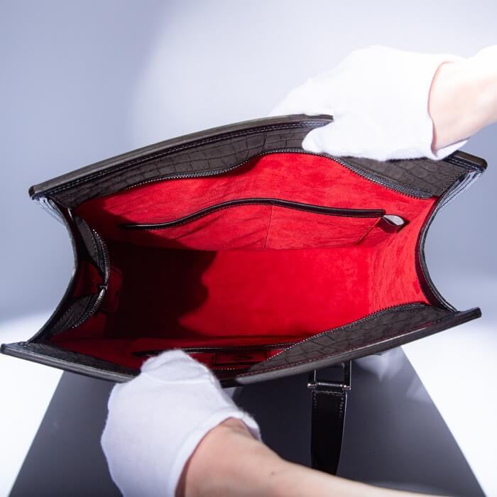クロコダイルの色々な部位を縫い合わせて一枚革の様に見せる、独特の技法を用いています。