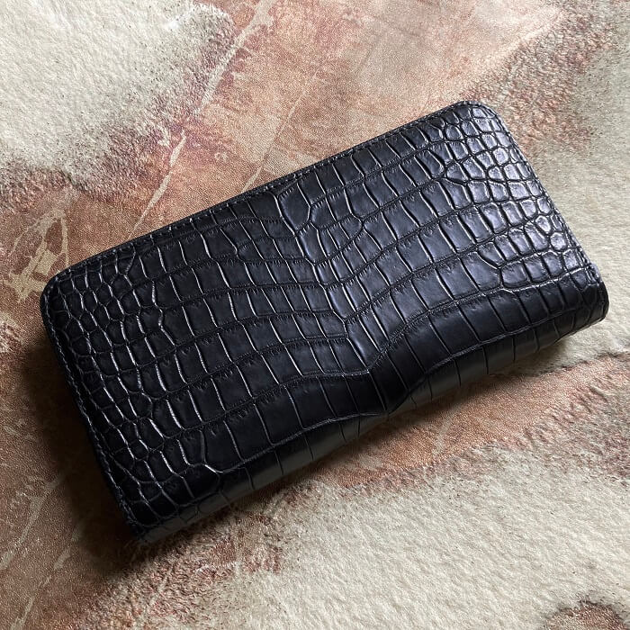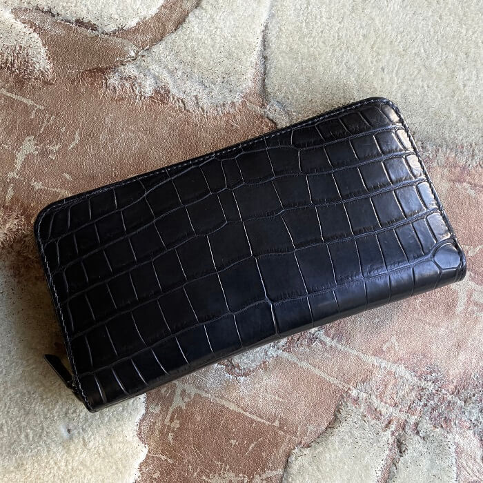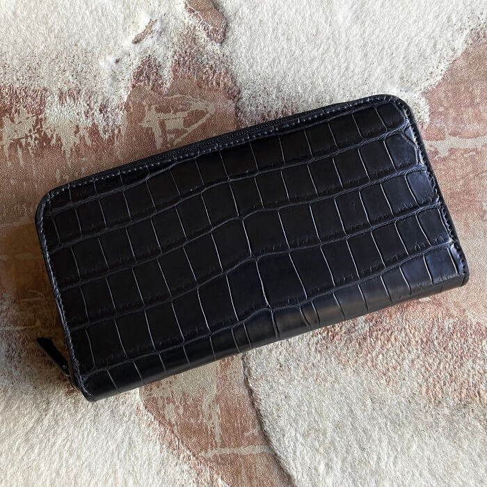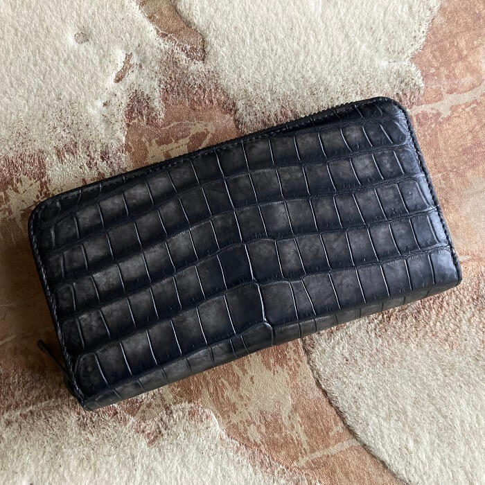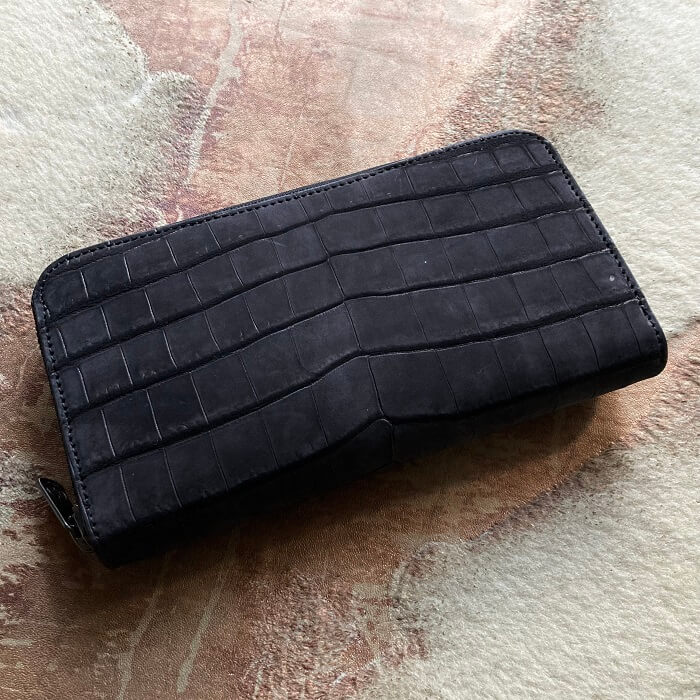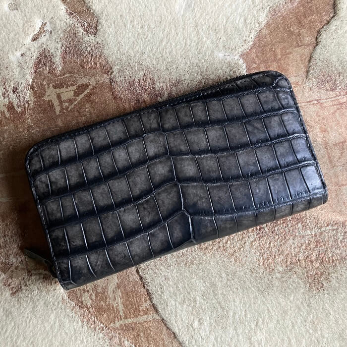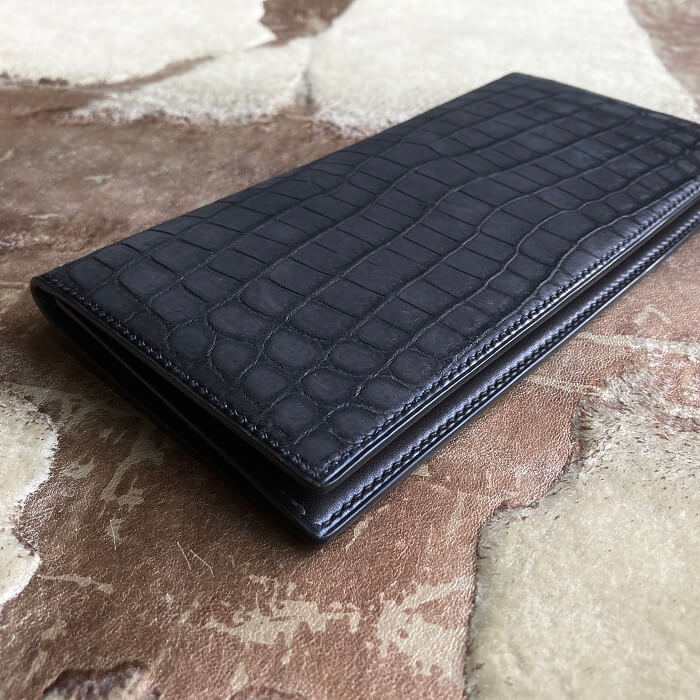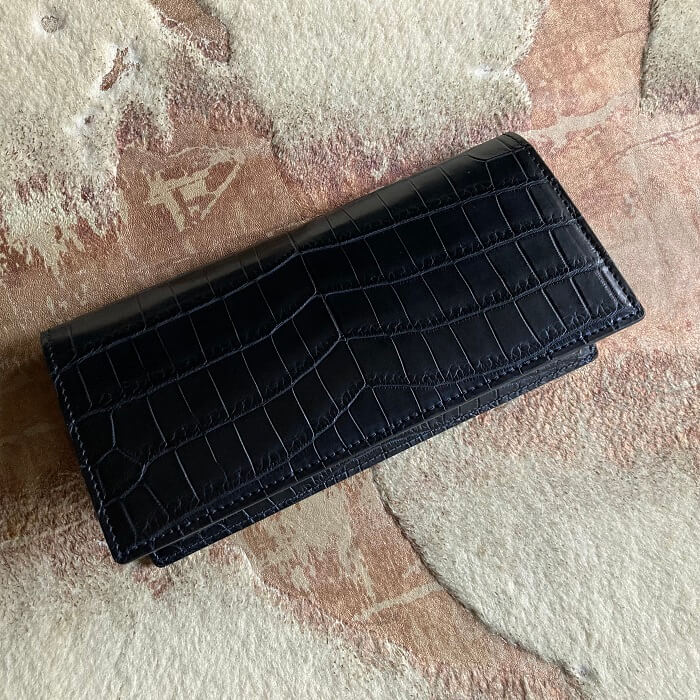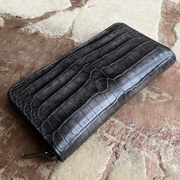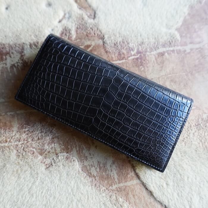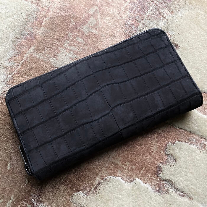 国内クロコダイル専門鞣し工場の特殊な技術を用いて墨で染を施した、異彩を放つナイルクロコダイルの長財布。
