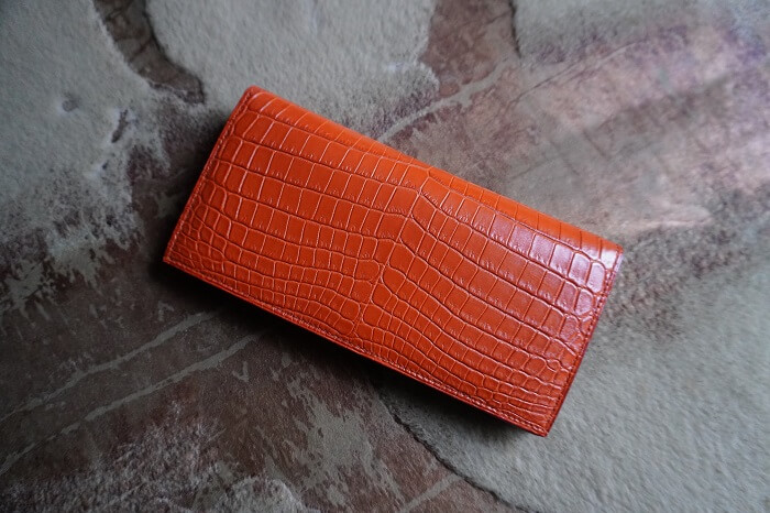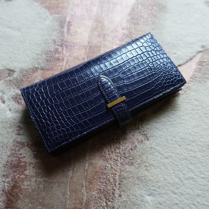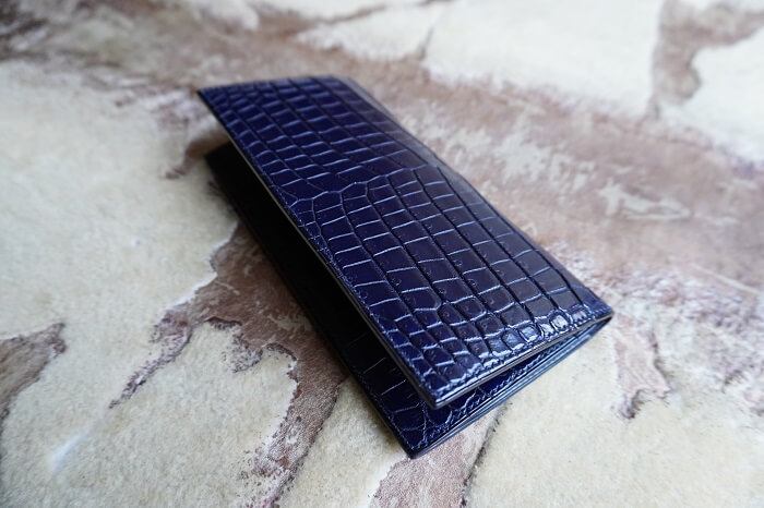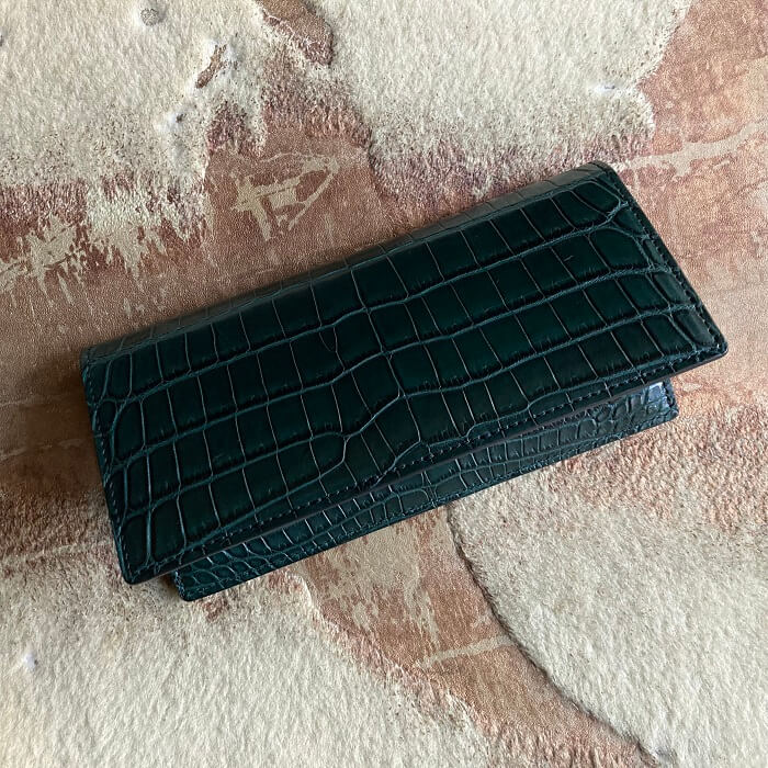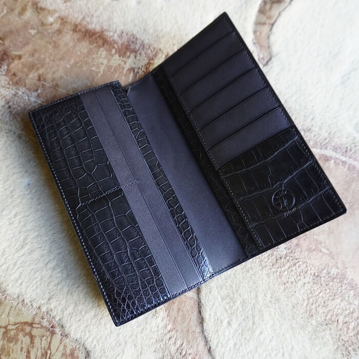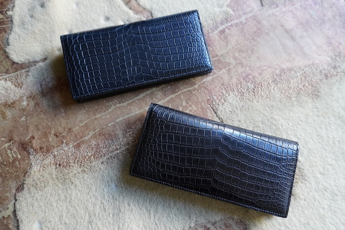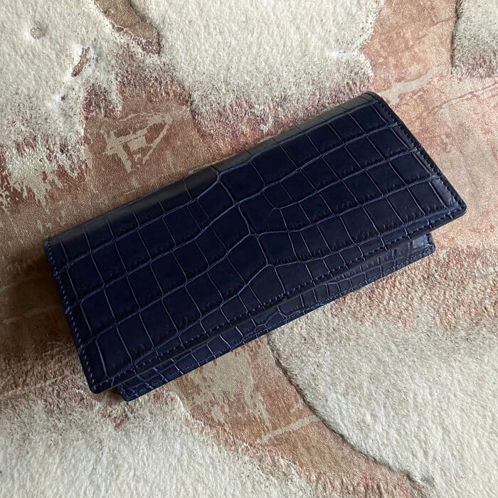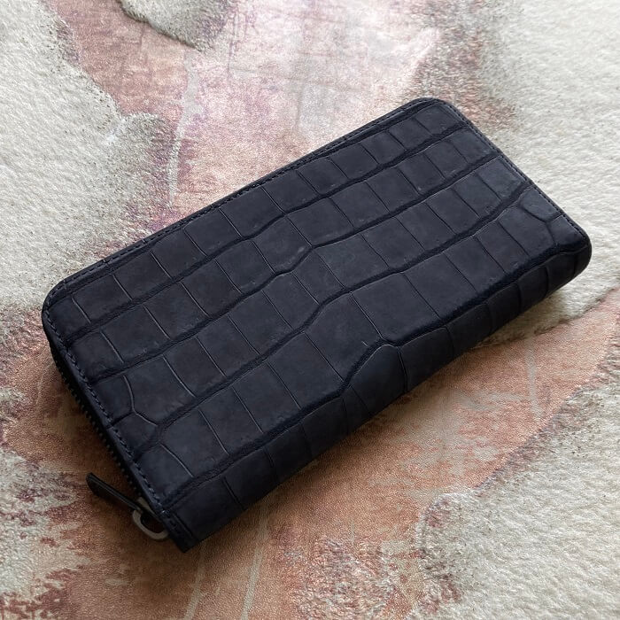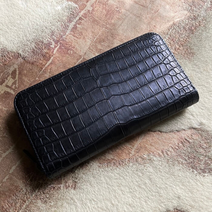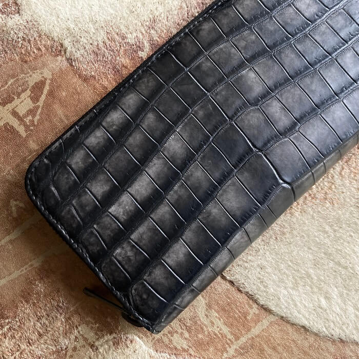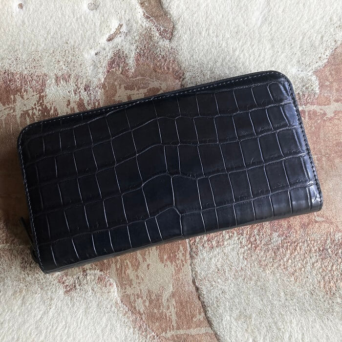 国内クロコダイル専門鞣し工場の特殊な技術を用いて墨で染を施した、異彩を放つナイルクロコダイルの長財布。