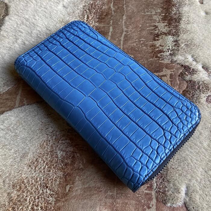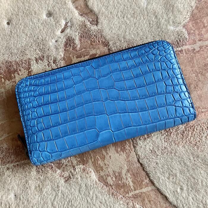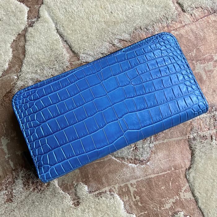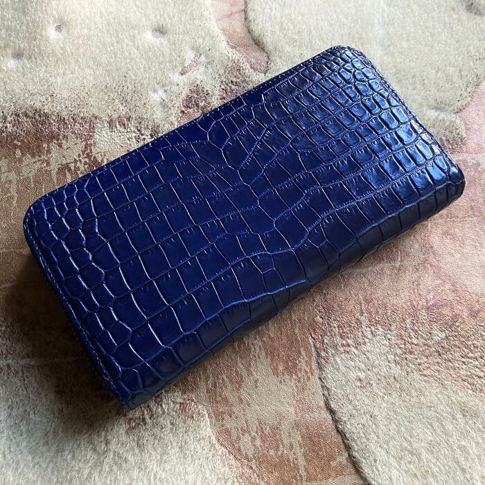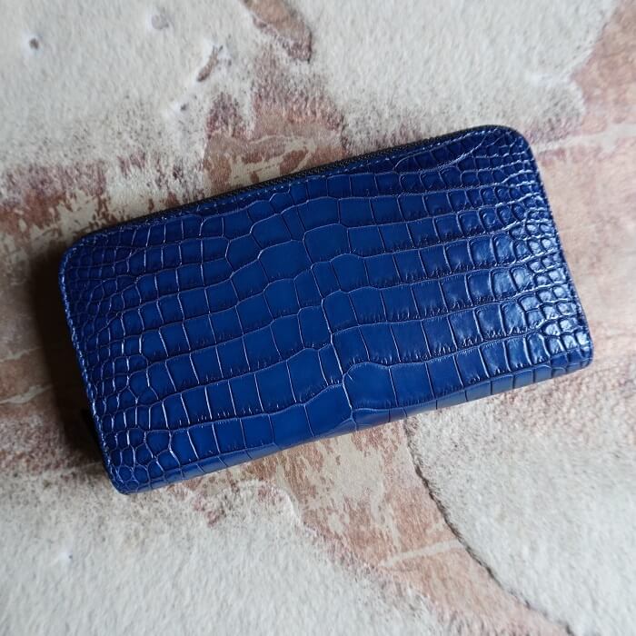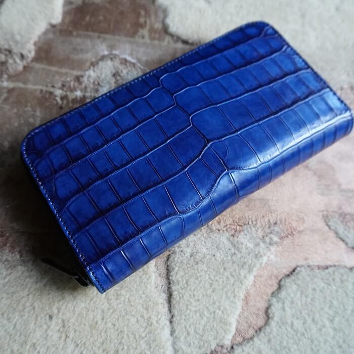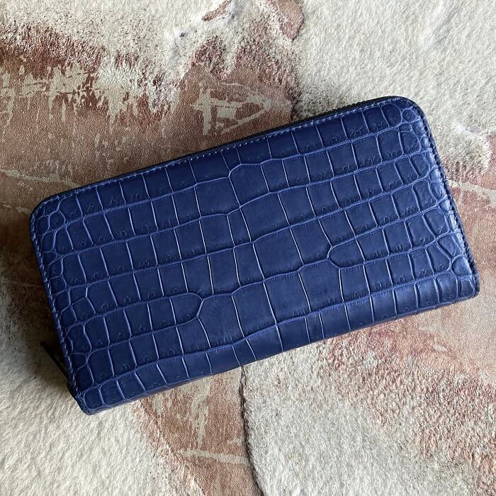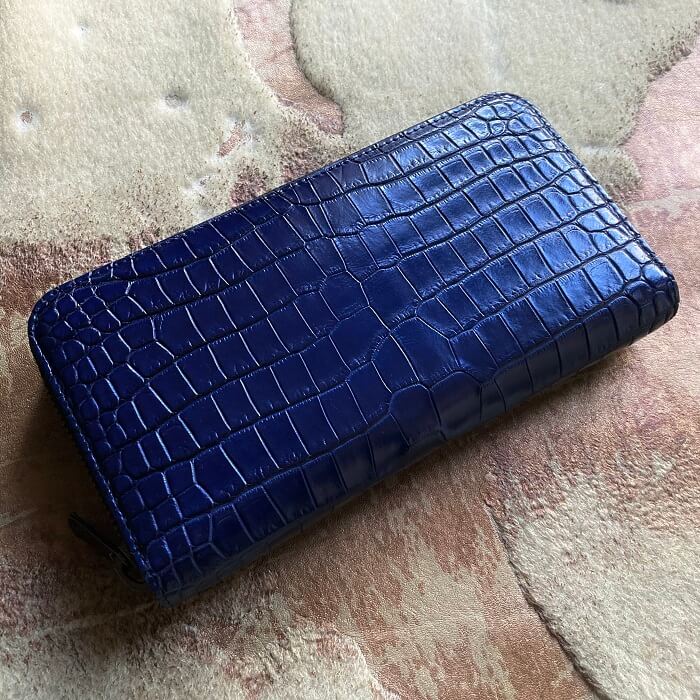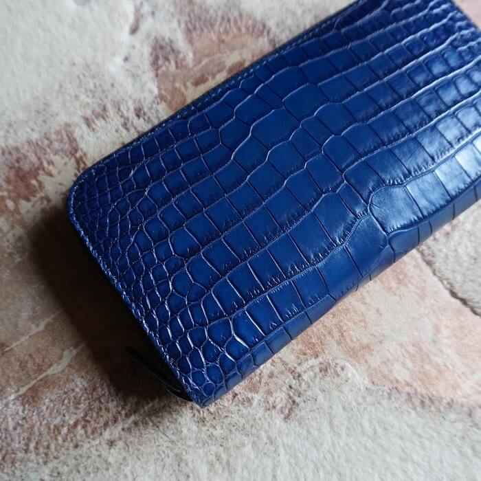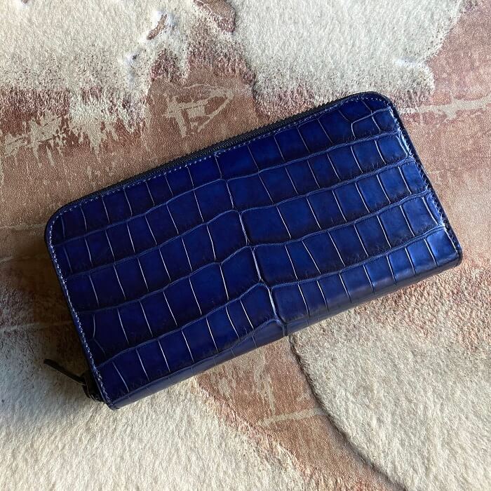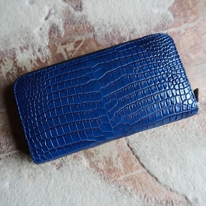 日本の伝統染色技法「藍染め」を施したナイルクロコダイル定番ラウンドファスナー長財布。