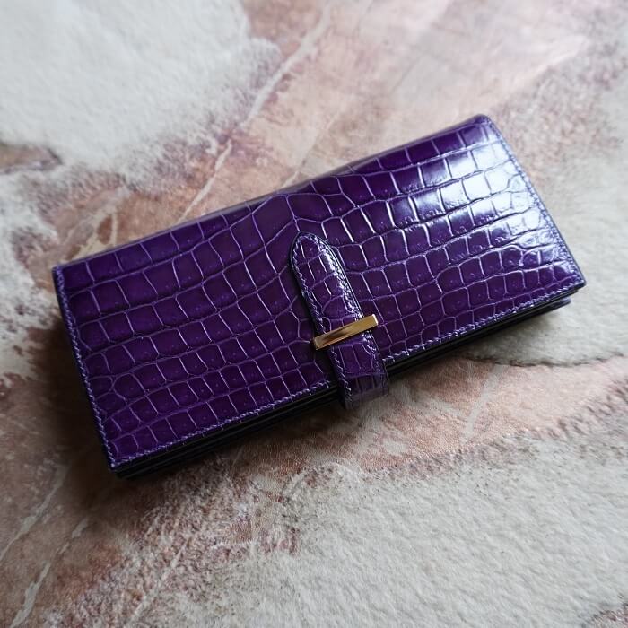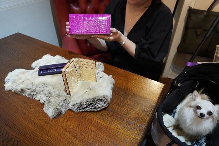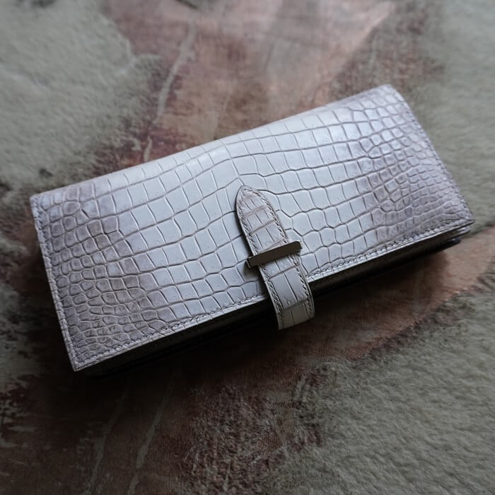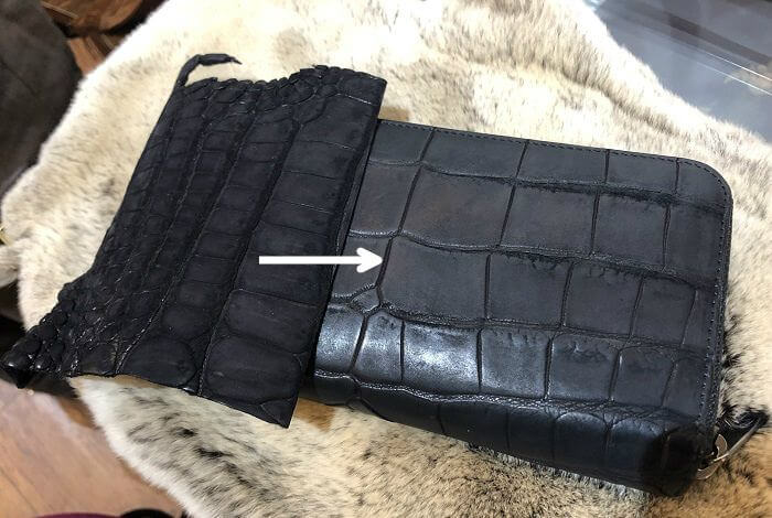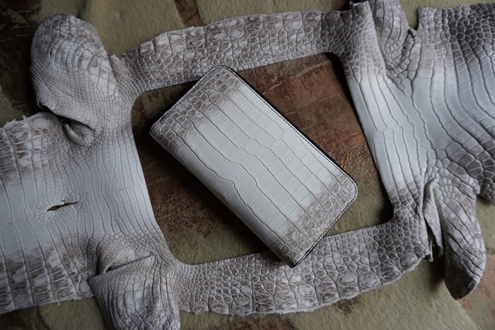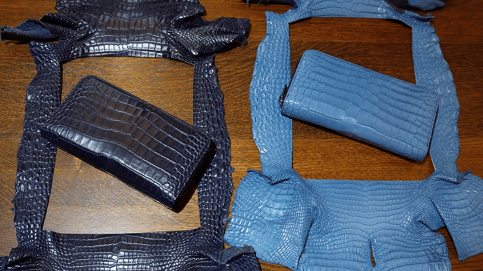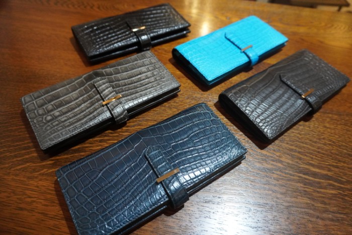 この様にクロコダイルの一番高級な腹部位のみを使用し一匹から一つだけ長財布を作成しています。