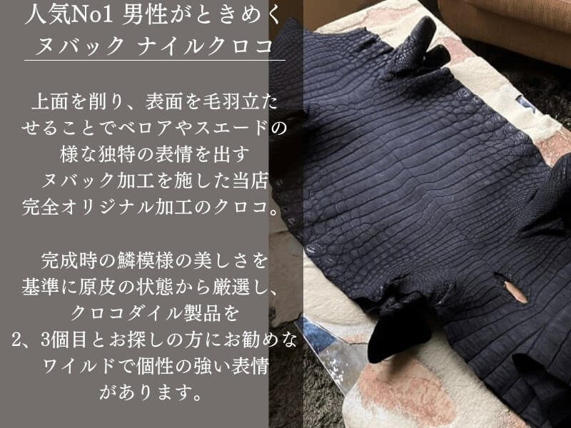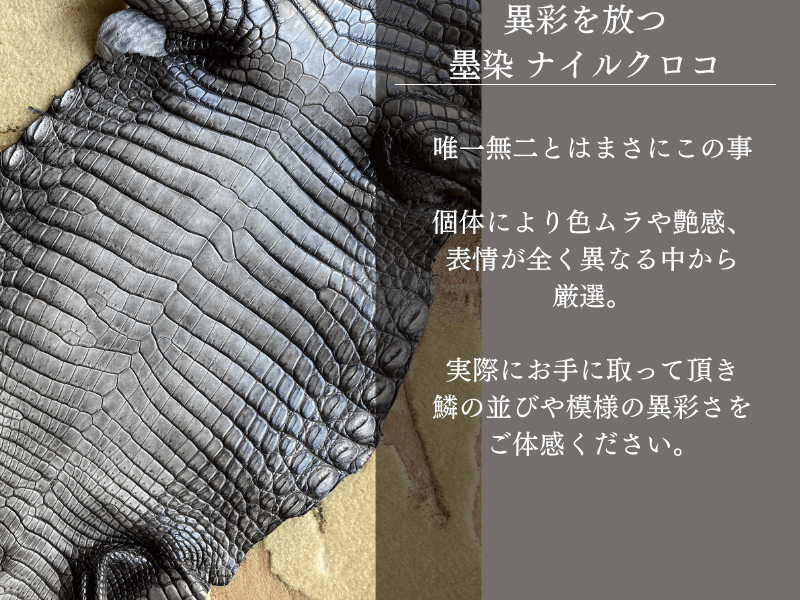 当店の貴重で「面白い」豊富なクロコダイルの中からあなただけの一枚をお選び頂けます。