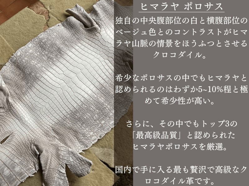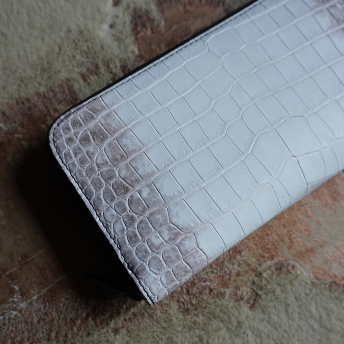 中でも圧倒的希少性でクロコダイルの頂点に君臨する「ヒマラヤクロコダイル」を使用し、国内最高手縫い仕立て技術で作成されたラウンドファスナー長財布。