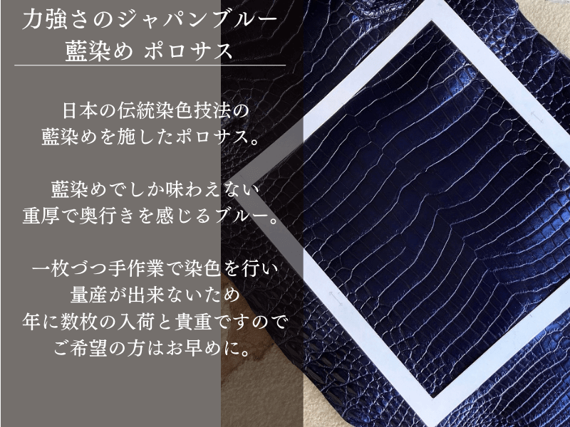 藍染クロコダイル/ジャパンブルーとして日本が世界に誇る伝統染色技法の藍染めを施したポロサス/スモールクロコダイルの長財布。