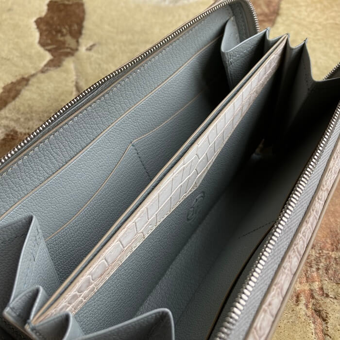 このシャープさ、お見事な作りです。技術の粋とはこの事。きっと誰もが出来る技ではありません。素晴らしい出来上がりです。よくぞここまでの完成度で作って頂きました。この薄さの中にこの大容量、表のクロコダイルのワイルドな表情からファスナーを開けると蝶が舞うかのような華やかさもあります。細部にまで細かな作業が丁寧に施されているのが一目で分かります。本当に美しい出来上がりです。