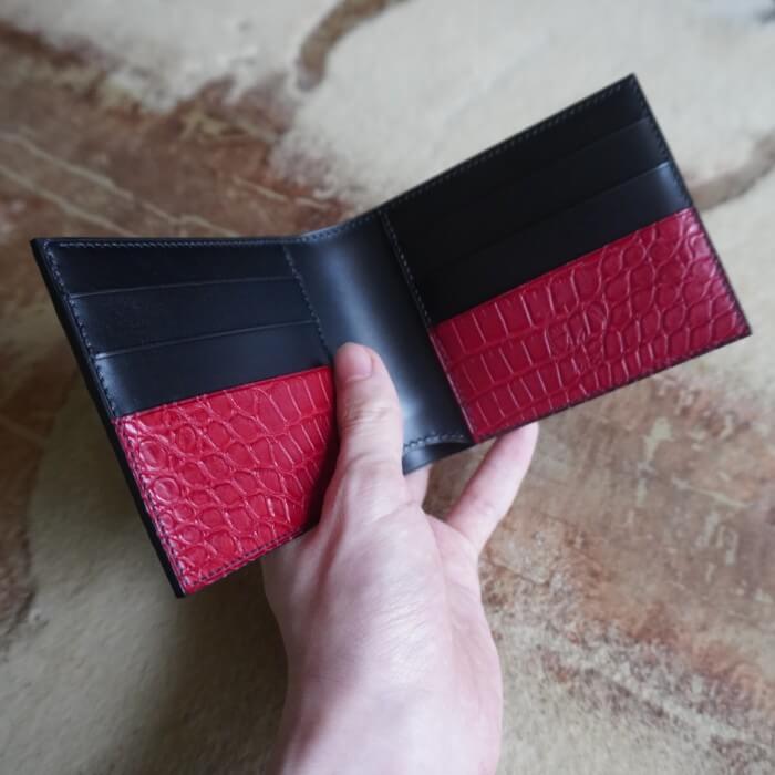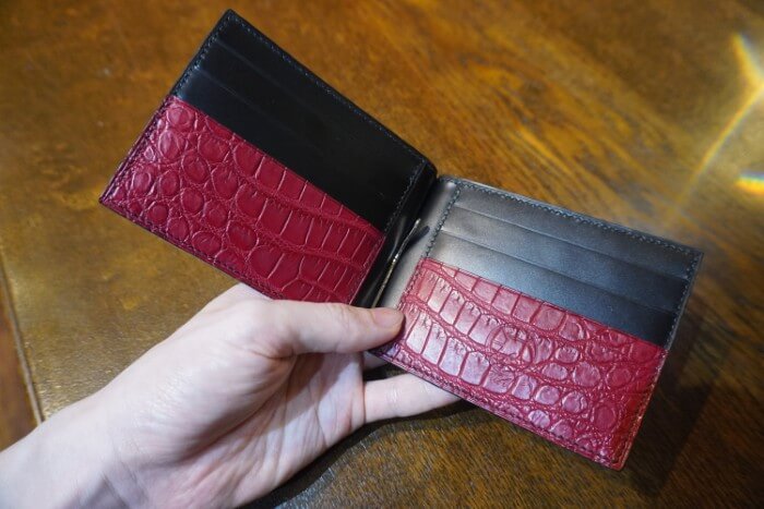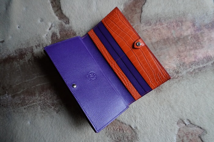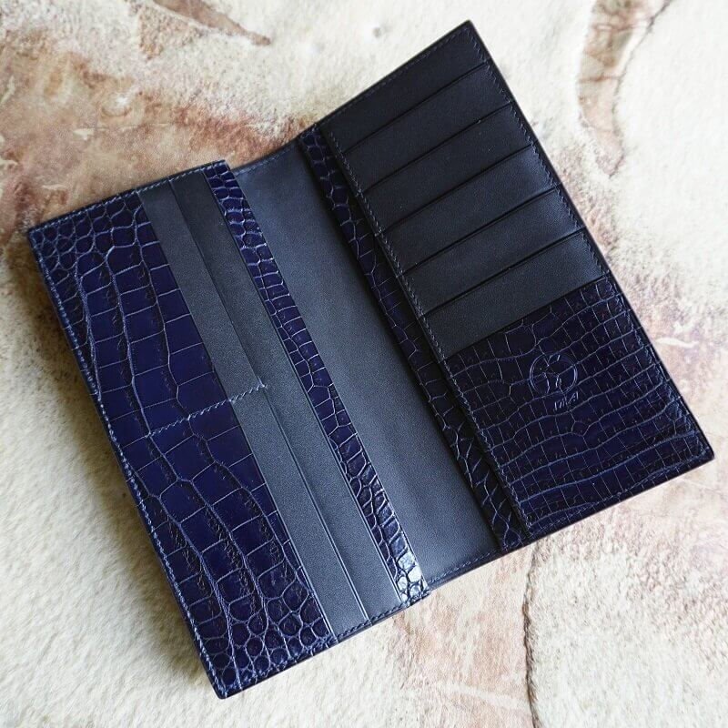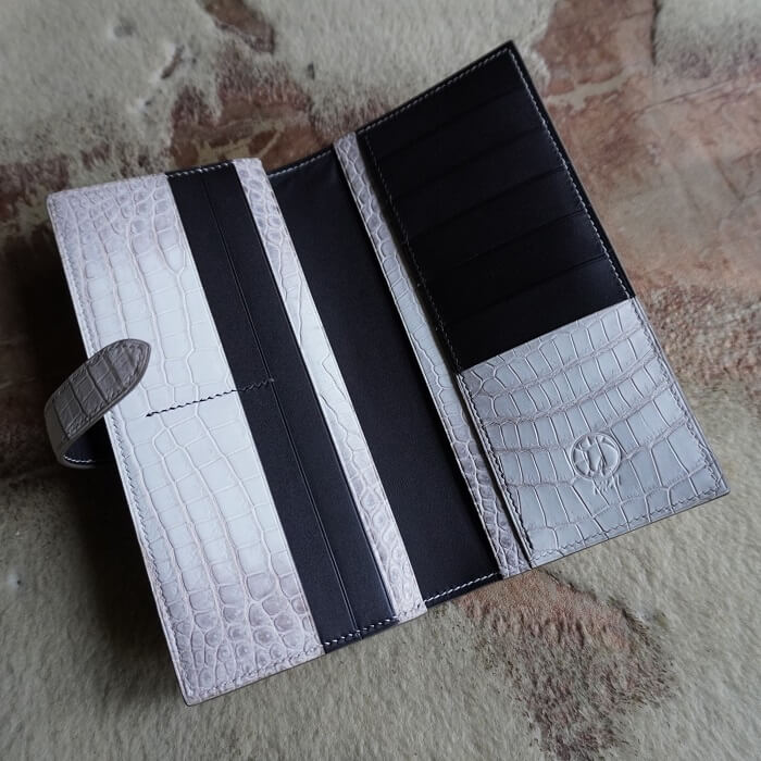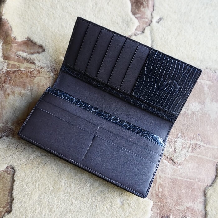 クロコダイルのクオリティーは勿論ですが、この財布の一番の拘りは「仕立て」です。内装はオールレザーに拘りとても繊細で美しい仕上がり。