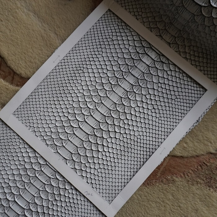 ワニ革を専門に扱っている革屋さんに出向き、色々な色や種類を見せて頂き、今回選んだのはグレイ仕上げのワイン色のワニ革。厳選した中で、この3枚から、また厳選。フの出方や傷、表情、光沢。どれが一番いいかな。。。じっくりと真剣に、でもあまり時間はかけず、やっぱり最後はワニ革から出るオーラを直観に感じたワニ革ためこんな風に手作業を施しています。
