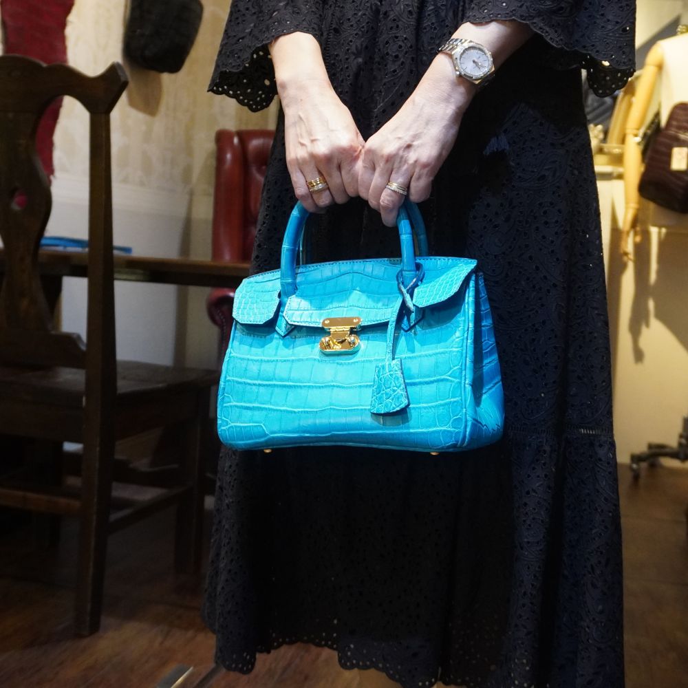 出来る女性経営者に仕立てた 鮮やかなターコイズブルーのクロコダイル/ワニ革ハンドバッグが完成。