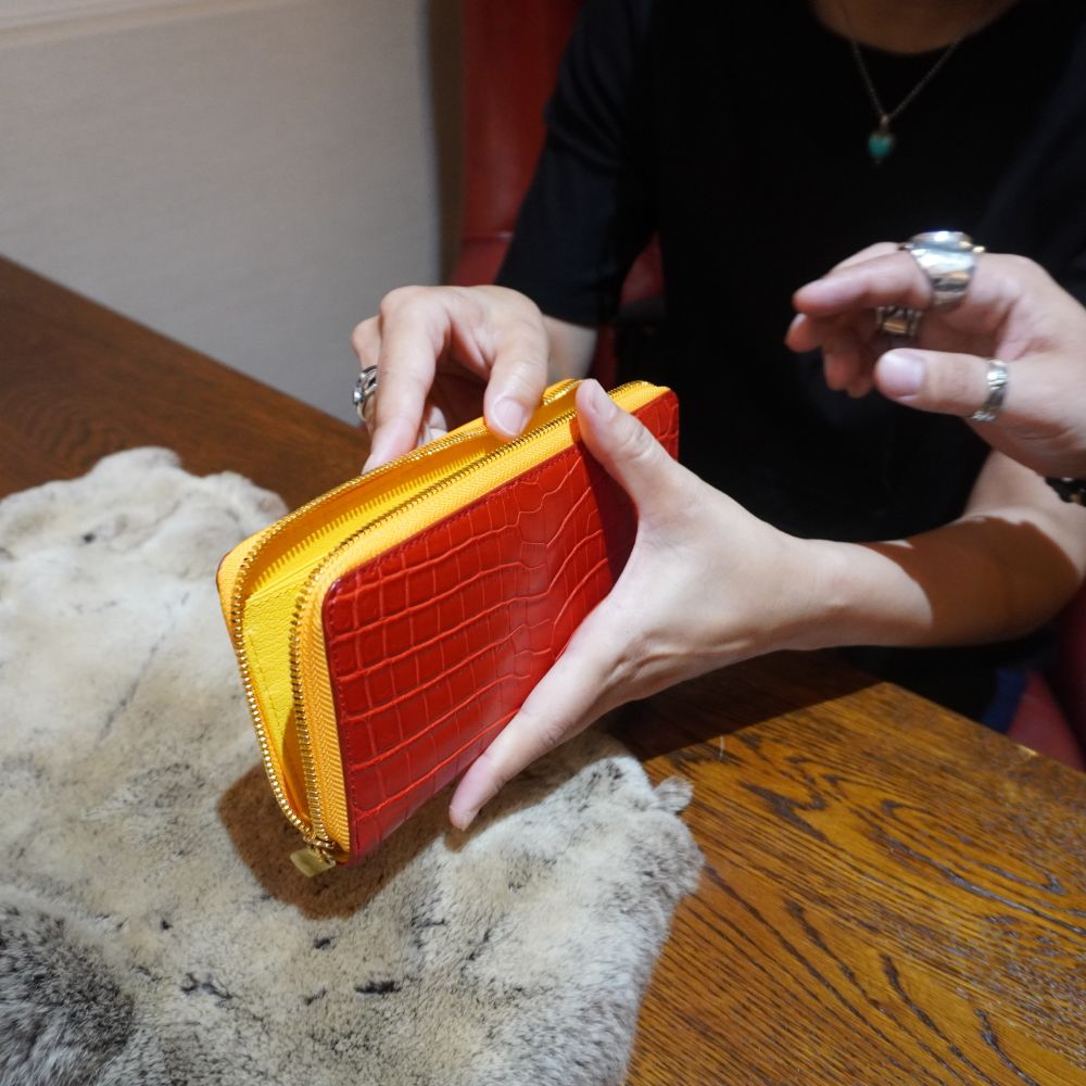 今回はとっても仲良しの素敵なご夫婦の奥様にクロコダイル/ワニ革や内側の革の色、ファスナー金具色など選んで頂きレザー長財布お作りさせて頂きました。