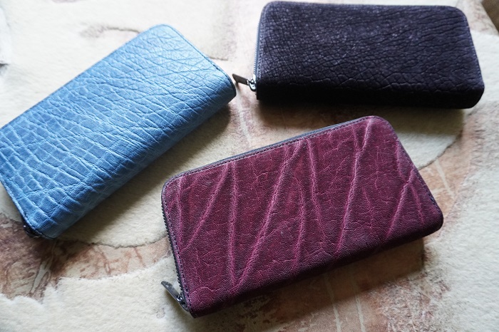 発色の良いブルーで象革の自然のシワ模様が存在感を引き立てます。
