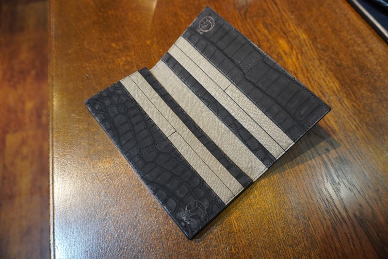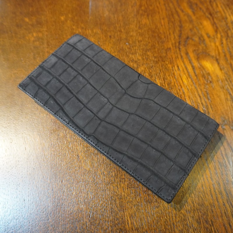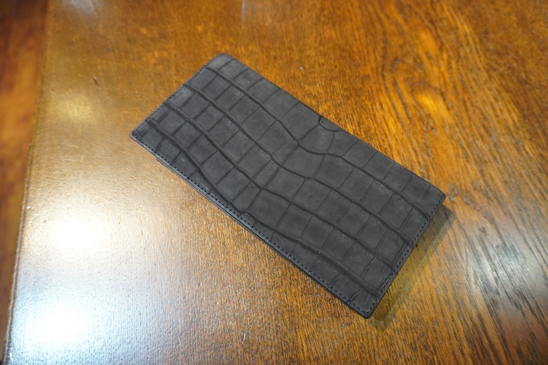 そして今回は100万収納財布をちょっとワイルドに作製して欲しいとの事で、選ばれたのはヌバッククロコダイル。 ご希望通りに革の取り方やロゴの位置も決めて頂き、大人の渋みがあるカッコ良いヌバックの財布が出来上がりました。