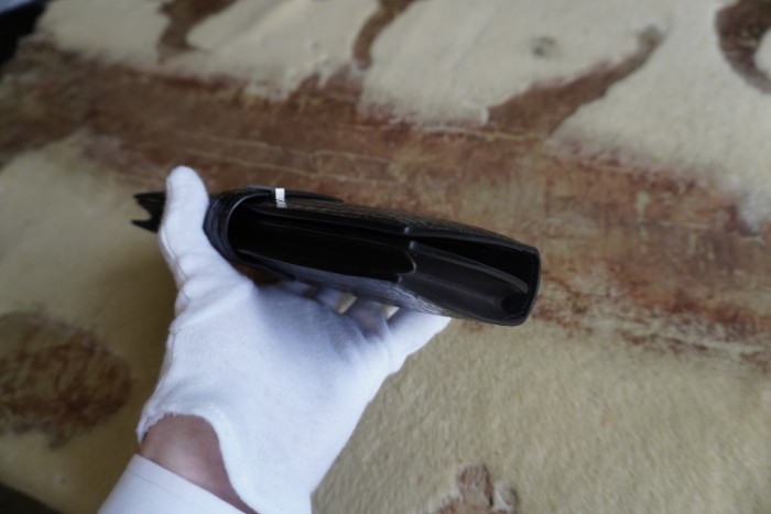 つまり世界全体のワニ革の約0.2~0.4%「1000枚中2~3枚しか見つからないこともある貴重な革ですが、当店はさらにその中から最終的に直接厳選した一枚で」一点物の財布を作成。