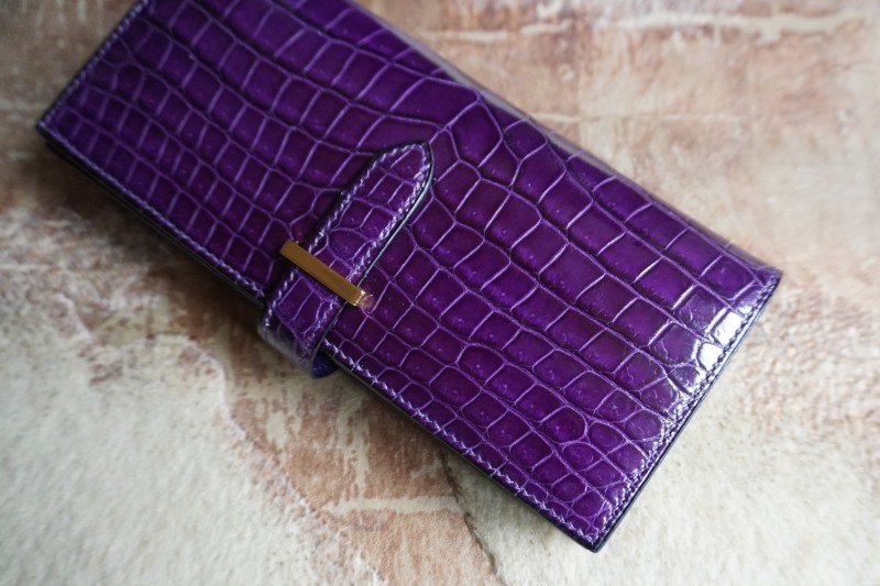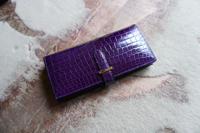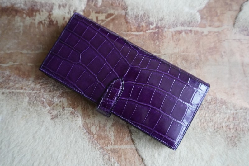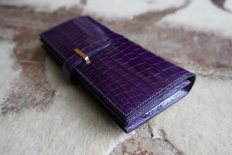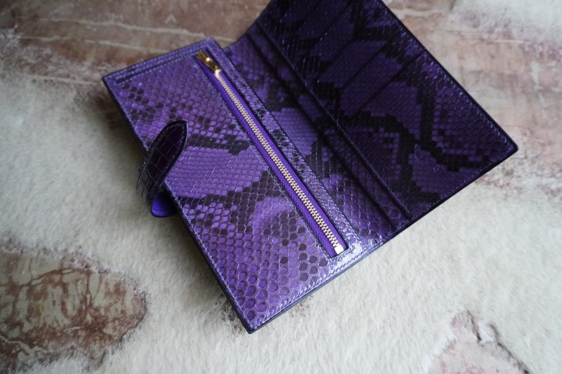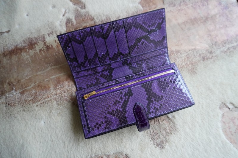 シャイニング紫ポロサス×パイソン100万円収納二つ折り長財布 2025.12.10 オーダーメイド, 二つ折り長財布 シャイニング加工紫ポロサスクロコダイル×パイソン二つ折り長財布 シャイニング加工を施した最高級品種ポロサス紫を使用し、内側には特注で染色加工した3.5mのパイソンをふんだんに使用して100万円が収納出来る二つ折り長財布を作成させて頂きました。
