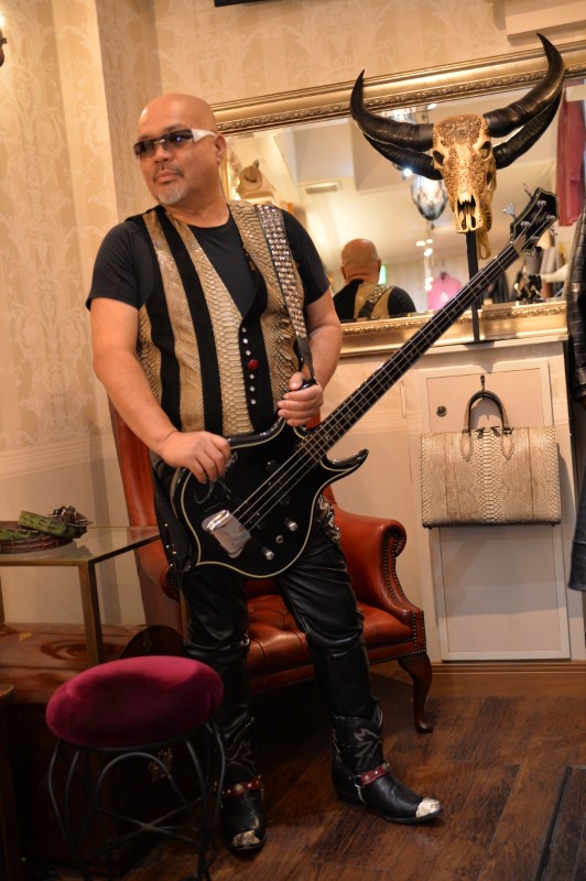 私がもっとビビッときたのはこのゴールド系のちょっとメタリックの入ったパイソンレザー。ロックバンドのkissが好きだったり、エイちゃんがお好きだったり、と好みをお聞きしていたので、このパイソンレザーを見た時に雰囲気はこっちだ。そう思い、このパイソンも提案させて頂いたら、やはりこちらに決めて頂きました。