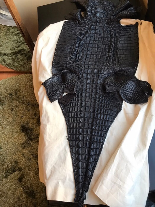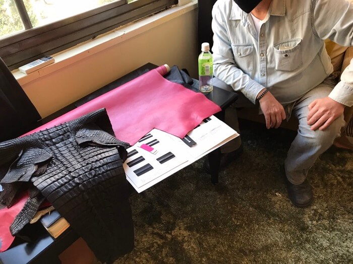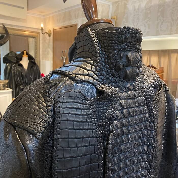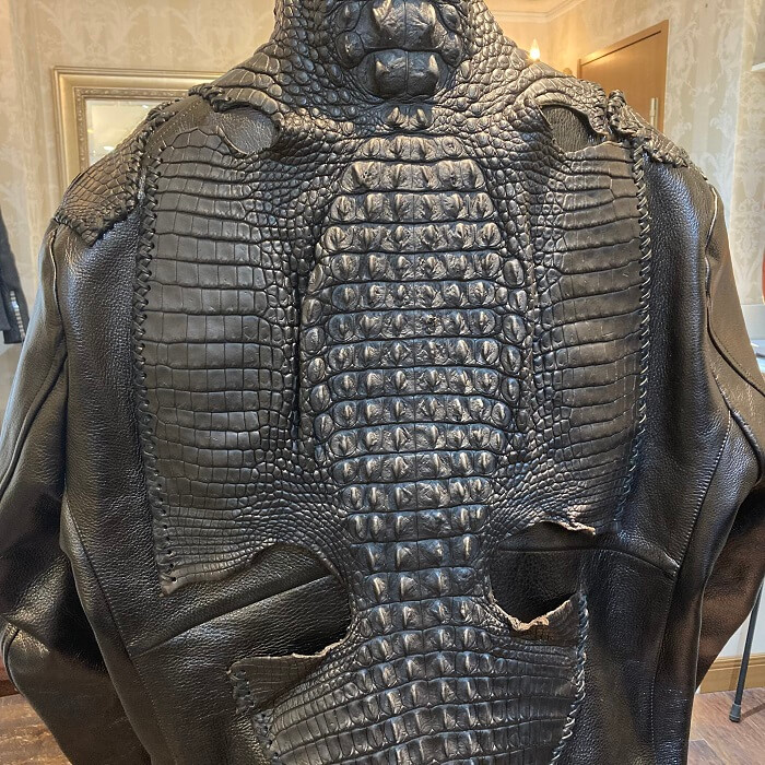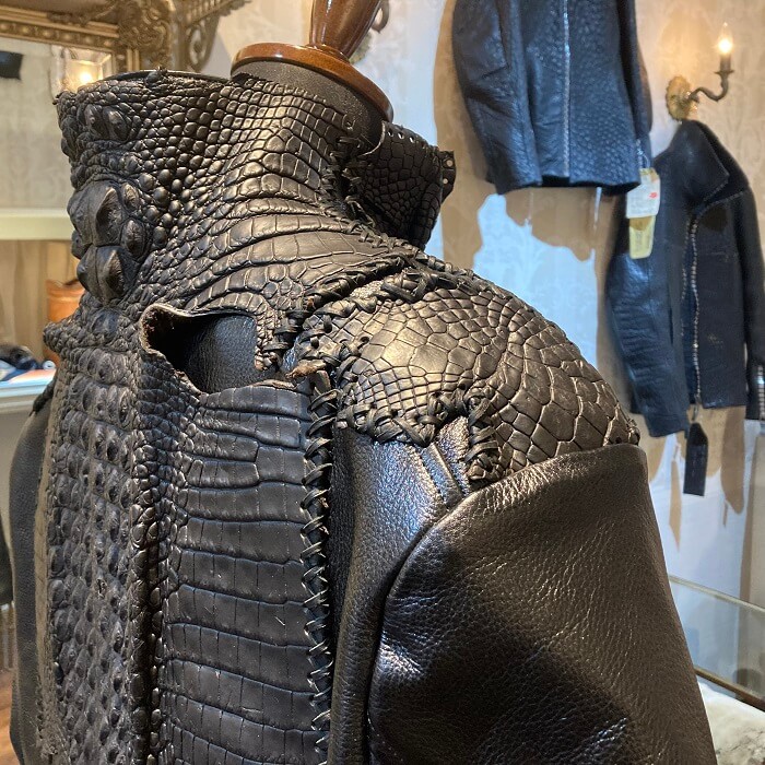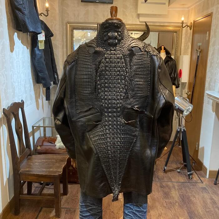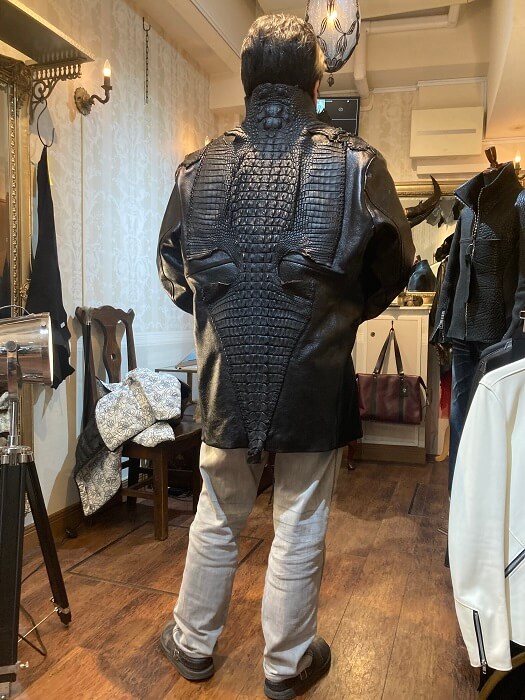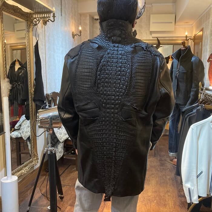 なんだこのジャケット~??っと店内に見に来る方続出、個性的な背ワニのジャケットの出来上がりです。背ワニの革を無駄なくカッコ良くまとめました。