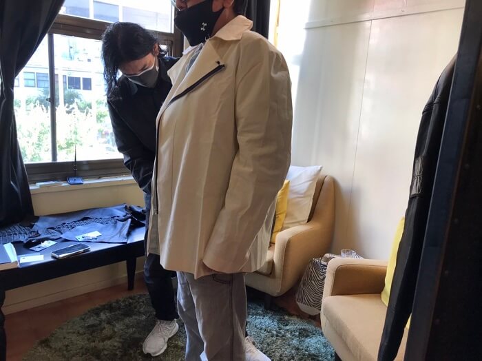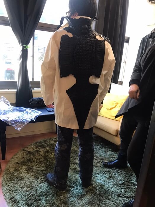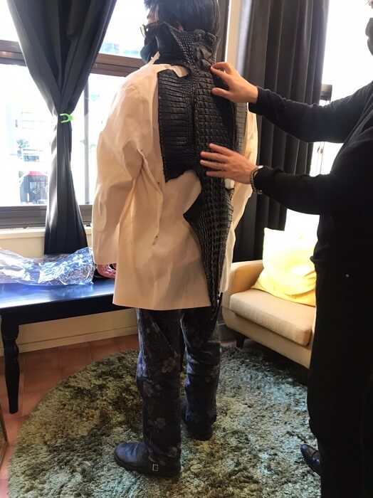 まずこの足部位をどうまとめるか、ここが一歩間違えればなんだかださーっくなるので、とても慎重です。クロコを体に合わせたりボディーに着せてみたりして三人で格闘です。どちらにしてもインパクトは凄いので、足はゆっくりとカーブを付けカットする事に。そしてサイズのチェックです。大きめがお好きなマコさんですが、あまり大きすぎてもやぼったくなるので、いつものジャケットよりはタイトに作ります。