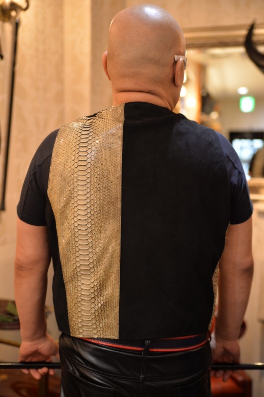 ヘビ革/パイソンのジレをフルオーダーして頂きましたオーナー様ご試着!似合ってます!
