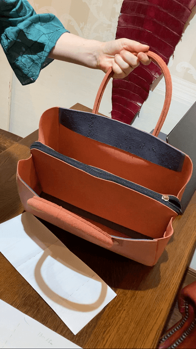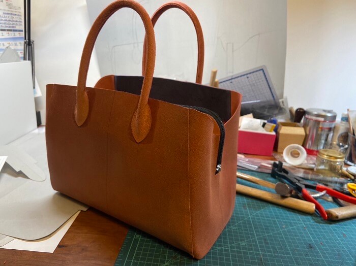 作る形は、写真などを送って頂きその形を元にサンプルを作成しました。このサンプルも実際に送って確認してもらいました。変更点は持ち手の長さでした。肩にもかけられるようにしたい、との事でしたので持ち手の長さをバランス良く少し長くしました。