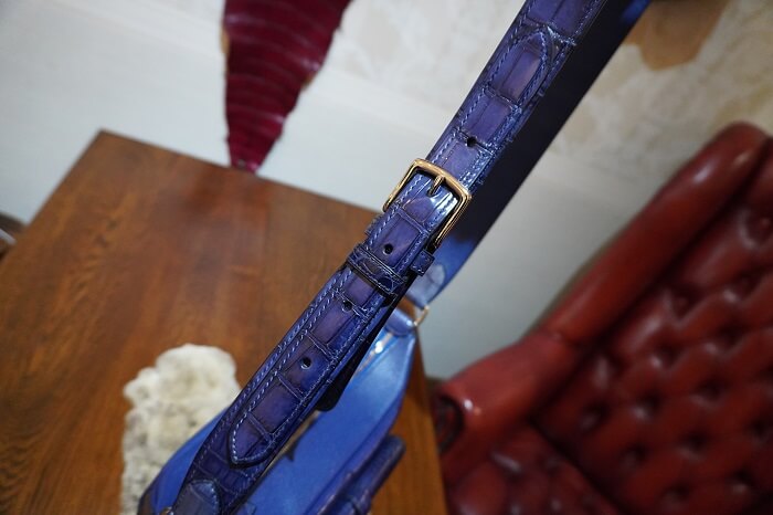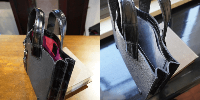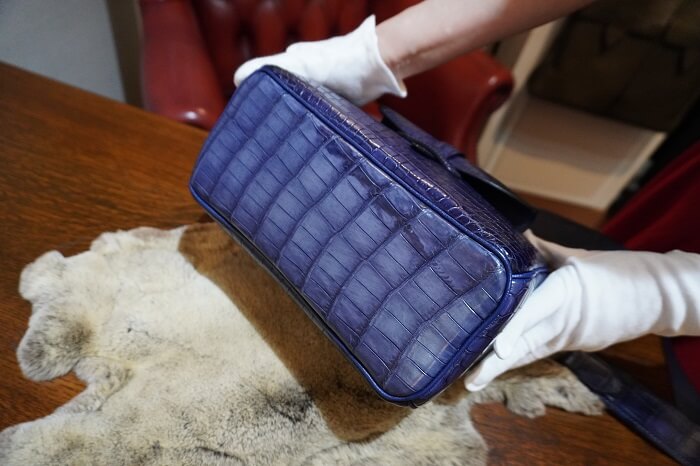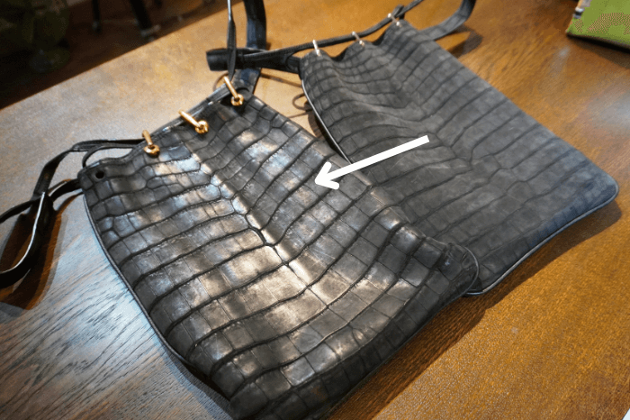 クロコダイルのお腹部位を4枚使用したので、表側、裏側、側面の全てをクロコダイルの腹部位を使用すると言うとても贅沢なクロコダイル鞄の出来上がりです。