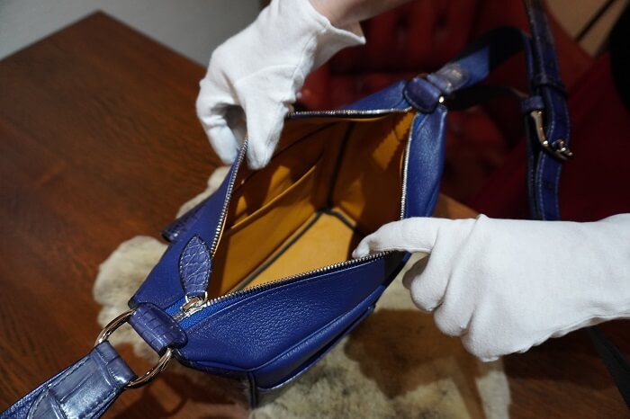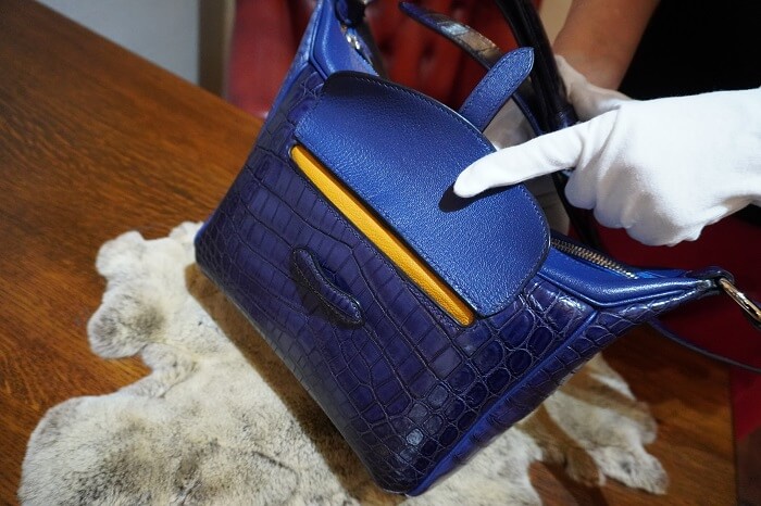 表は全てをクロコダイルにしないで、ヤギ革を使う事で品よくまとまりました。内側にはお客様の選ばれたマスタード色、ネイビーのクロコダイルにあいますね。バックを開けると鮮やかな色が飛び込んできます。形もそうですが革の素材や配色の色、そして金具まで一緒に決めていきます。こういうのがオーダーの楽しみですね。