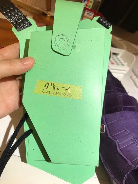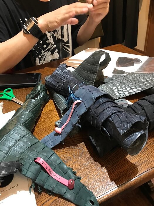 サンプルを作り細かなところは試し縫いをして細かなところを確認しながら、背ワニもどうカットして使うか何度も何度も打ち合わせをしながら決めていきます。大まかなことが決まったのでこれで作製に入っていきます。