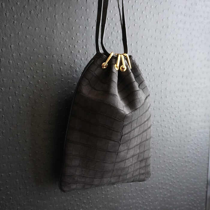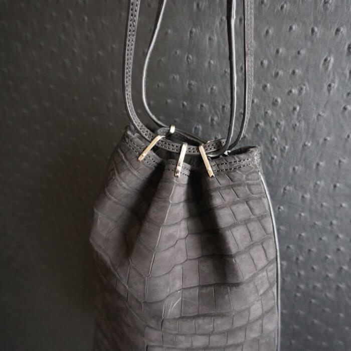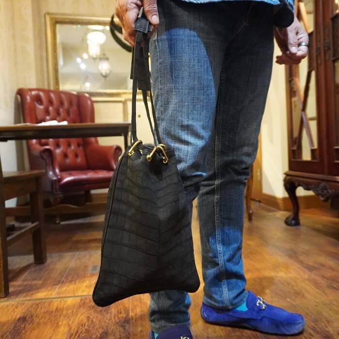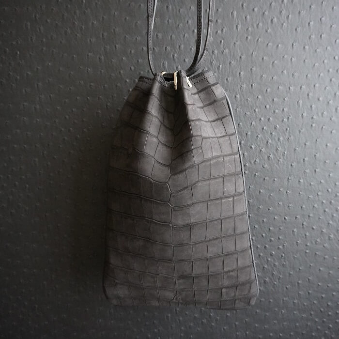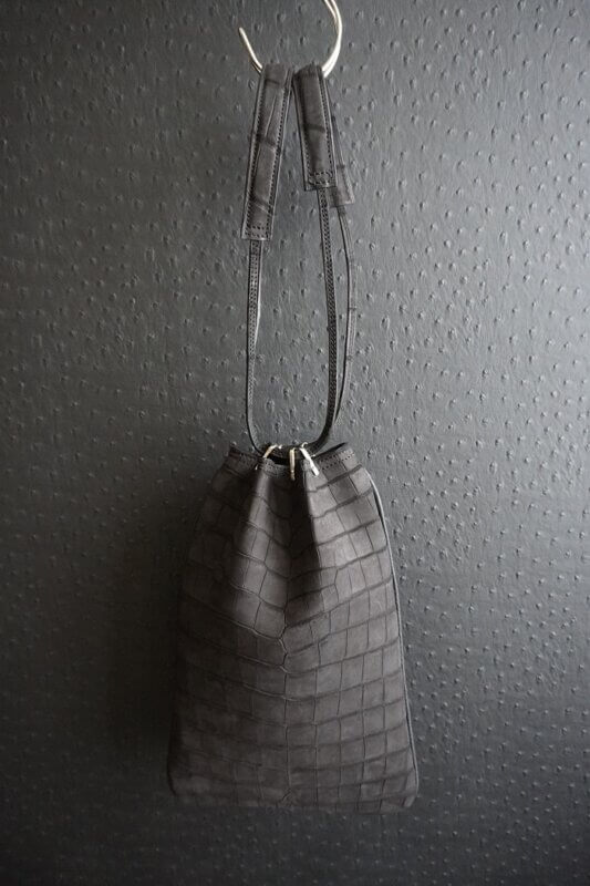 ヌバック加工をしたクロコダイル最高級品種ポロサスを2枚使用し、前面と背面に腹部位を使用した一点物です。