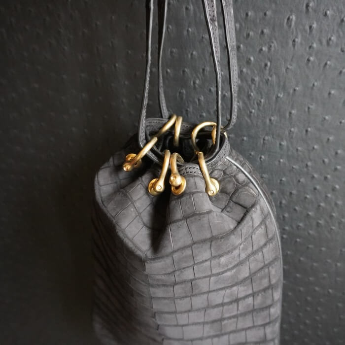 かつて海外メゾンがオートクチュール専門店として鞄を仕立てていた「1800年代の鞄創り」にインスパイアされた職人が馬車道今井オリジナル素材のヌバッククロコダイルで仕立て上げた一点物のバッグ。