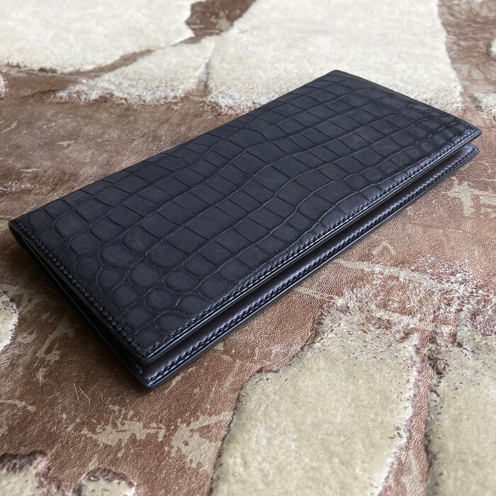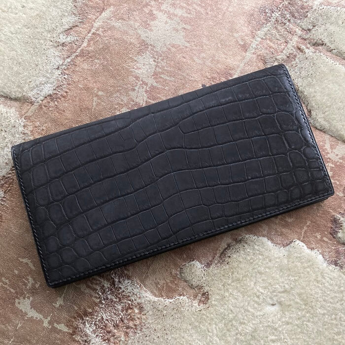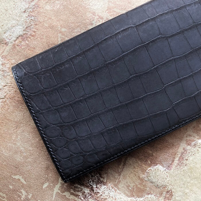 ヌバック加工をしたクロコダイル最高級品種ポロサスを2枚使用し、前面と背面に腹部位を使用した一点物です。