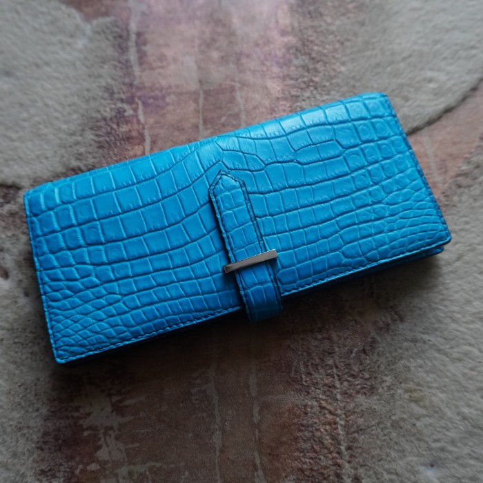 ターコイズブルークロコダイル二つ折り長財布 2025.10.29 オーダーメイド, 二つ折り長財布 今回は今人気のターコイズのクロコダイルを使用した二つ折り長財布の紹介です。 ターコイズのクロコダイルの経年変化はとても魅力的で、今回のお客様もこのターコイズブルーを気に入って頂きました。 二つ折りの長財布の要望が多かったので、お客様のご厚意に甘えて今回作らせて頂いた形は馬車道今井の定番の形とさせて頂きました。 内側に使用した国産ロイヤルカーフレザーはとてもきめが細かく、独特の艶感があります。 今回もお忙しい中、何度も足を運んで頂き、ご協力頂きありがとうございます。