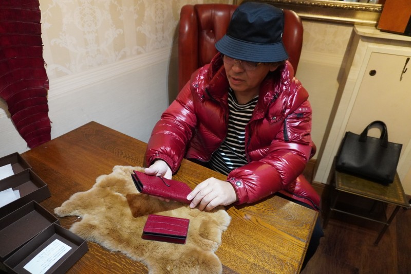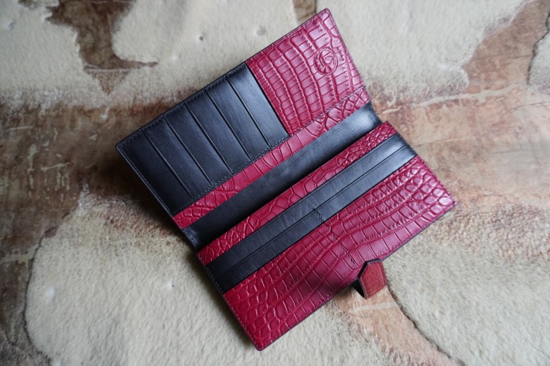 ご来店頂いた時にこのワインのクロコダイルを気に入って頂き、サイズも長財布には丁度のサイズで、クロコのクオリティーもとても綺麗な状態。 革屋さんで念のためもう一度、革を確認しましたが、やはりこのクロコの革が一番だったのでこのワイン色のクロコ革に決定。